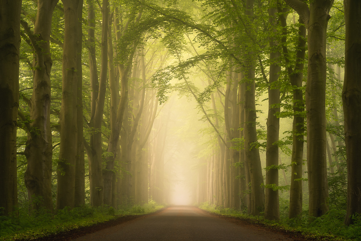 Een weg door het mistige bos in de lente.