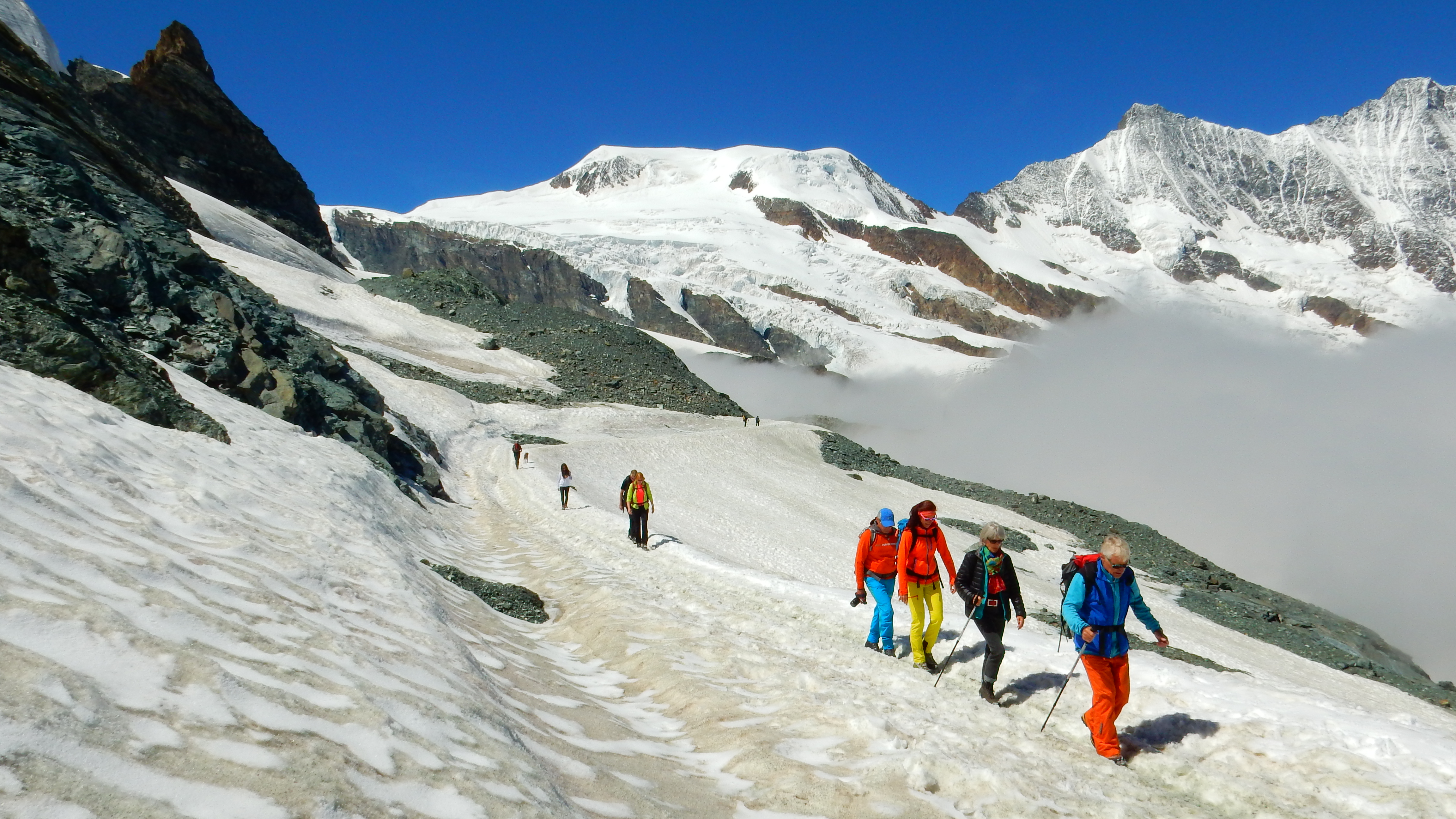 Onder de 4000 duizender Allalinhorn ligt het hoogte pad naar de Britanniahut op ruim 3000mtr...eenmaal de Mittagshorn voorbij kom je langs Egginer en dan sta je ineens voor de berghut Nikon Coolpix S9700 (Zwitserland Wallis Saas-Fee)