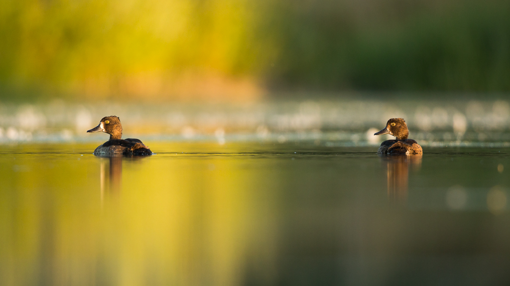 Terwijl de rechterhelft van de achtergrond zich in de schaduw bevond werd de linkerhelft mooi verlicht door de ondergaande zon. Precies op dat moment besloot een groepje jonge Kuifeenden voorlangs dit mooie moment langs te zwemmen wat resulteerde in deze foto.