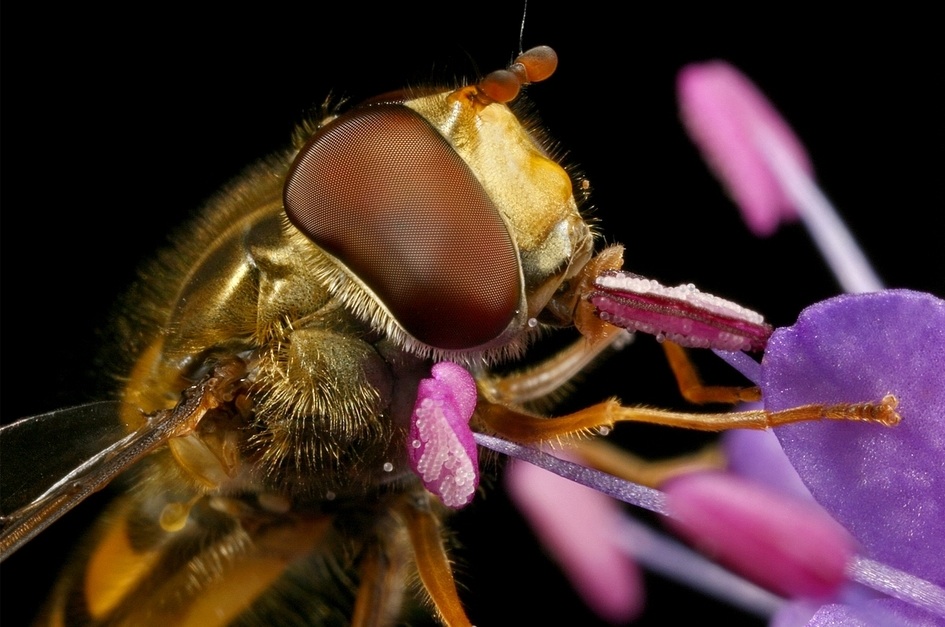 Deze foto van een pyama zweefvlieg(Episyrphus Balteatus) is mijn allereerste macro foto met de specialistische macrolens van Canon, de MP-E 65mm. Erg mooi gelukt vind ik de facetten van het oog en de details van de stuifmeelkorrels.