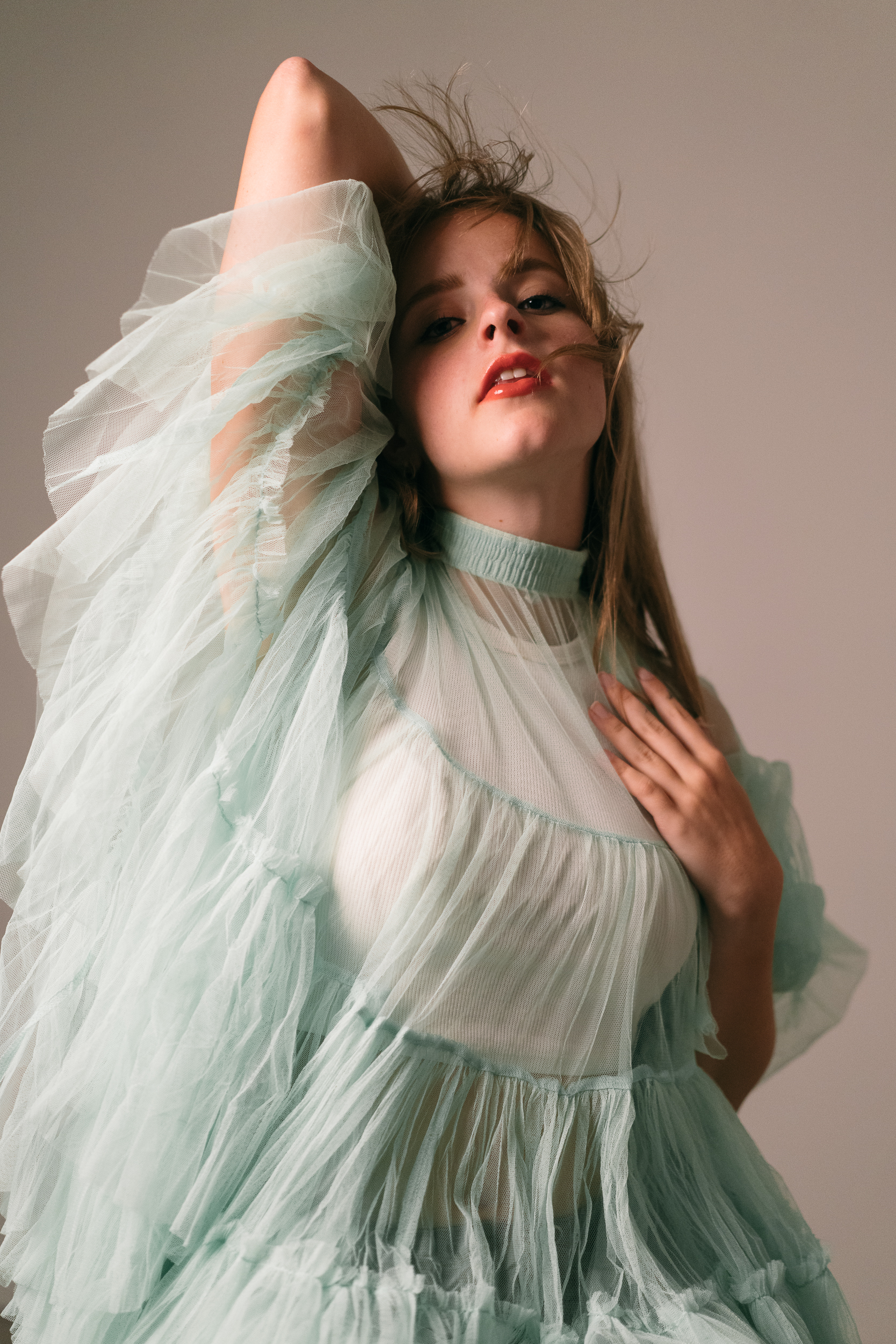 Heel blij met dit resultaat! Continulicht met softbox op links, ventilator op rechts. Tule kleding (mintgroene petticoat) gevonden op Vinted, eigen bezit.
