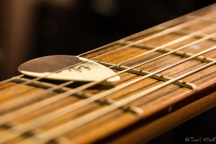 Macro opname van Plectrum geklemd tussen gitaar snaren.
