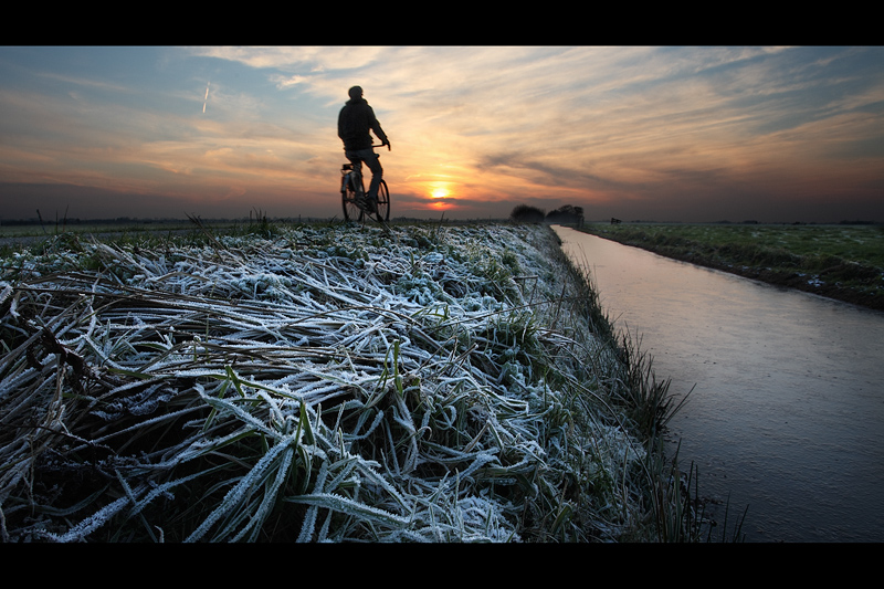 Een eenzame fietser op de Hollandsche Kade bij Kockengen op een vorstige avond.
