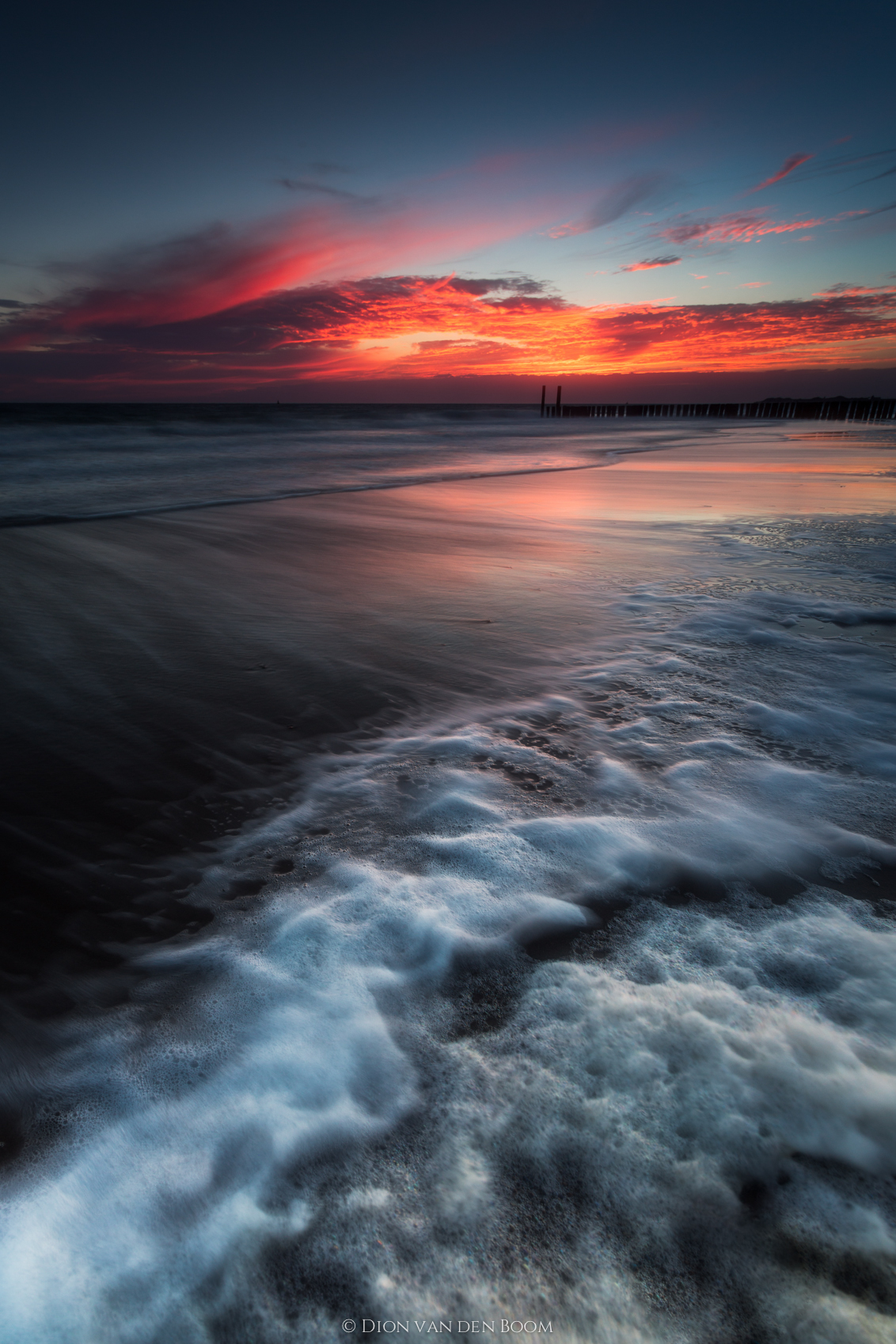 Het opkomend water legt met iedere golf mooie structuren van schuimkoppen neer op het strand. Een dankbaar onderwerp voor op de voorgrond. De ondergaande zon zorgt voor prachtige vuurrode wolken aan de horizon. Op zo'n moment heb je niets meer nodig om gelukkig te zijn.