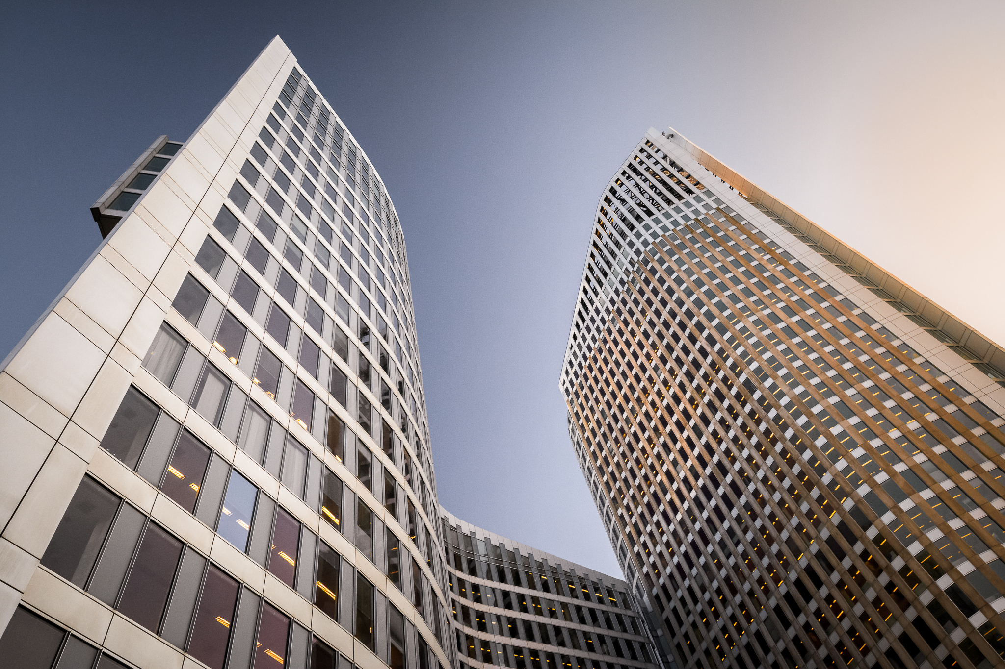 Ik was voor een opdracht in Den Haag en liep toevallig langs mijn favoriete gebouw; De Hoftoren. De zon was net onder en de kleuren en het licht van het vroege blauwe uurtje nodigden mij uit om deze compositie maar weer eens vast te leggen...