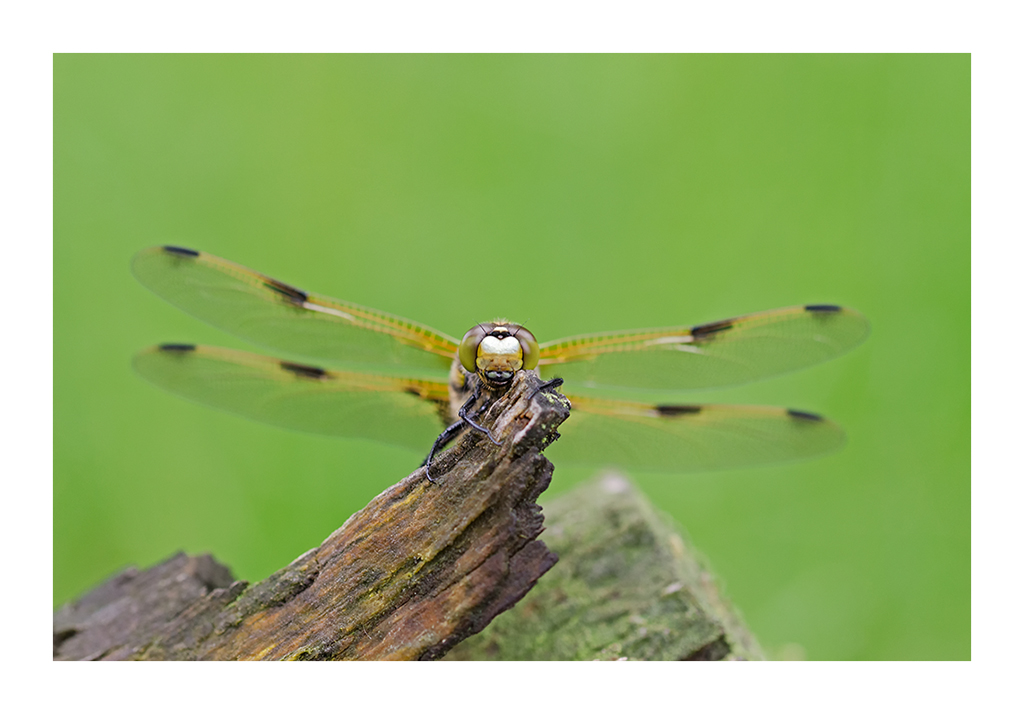 Deze libel frontaal van voren gefotografeerd. De vleugeltjes als bokeh gebruikt.