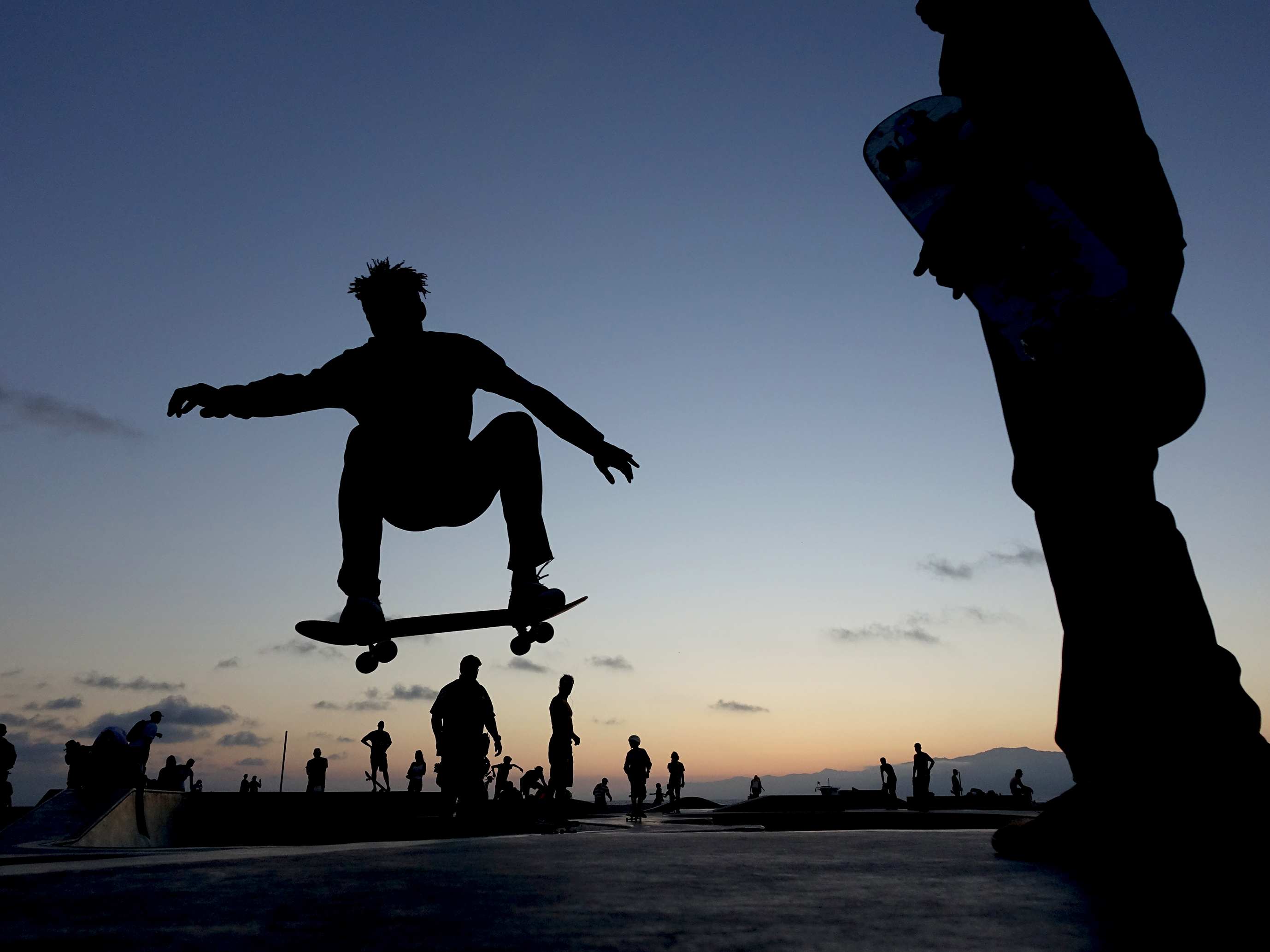 Skateboarder op Venice Beach, California, bij ondergaande zon.