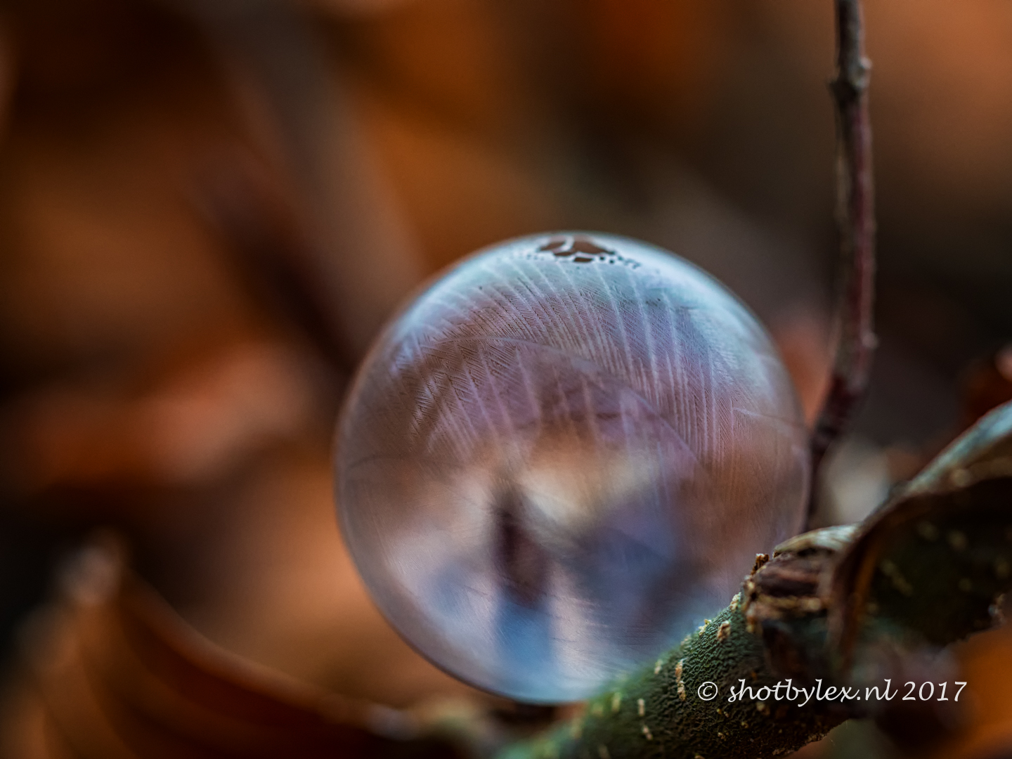 Bevroren zeepbelletje op een beukenhaag. Door heel veel bellen te blazen en te hopen dat er eentje op een mooie plek intact blijft heb ik deze foto kunnen maken. Uit de hand op 800 iso, sluitterijd 1/100. F2.8