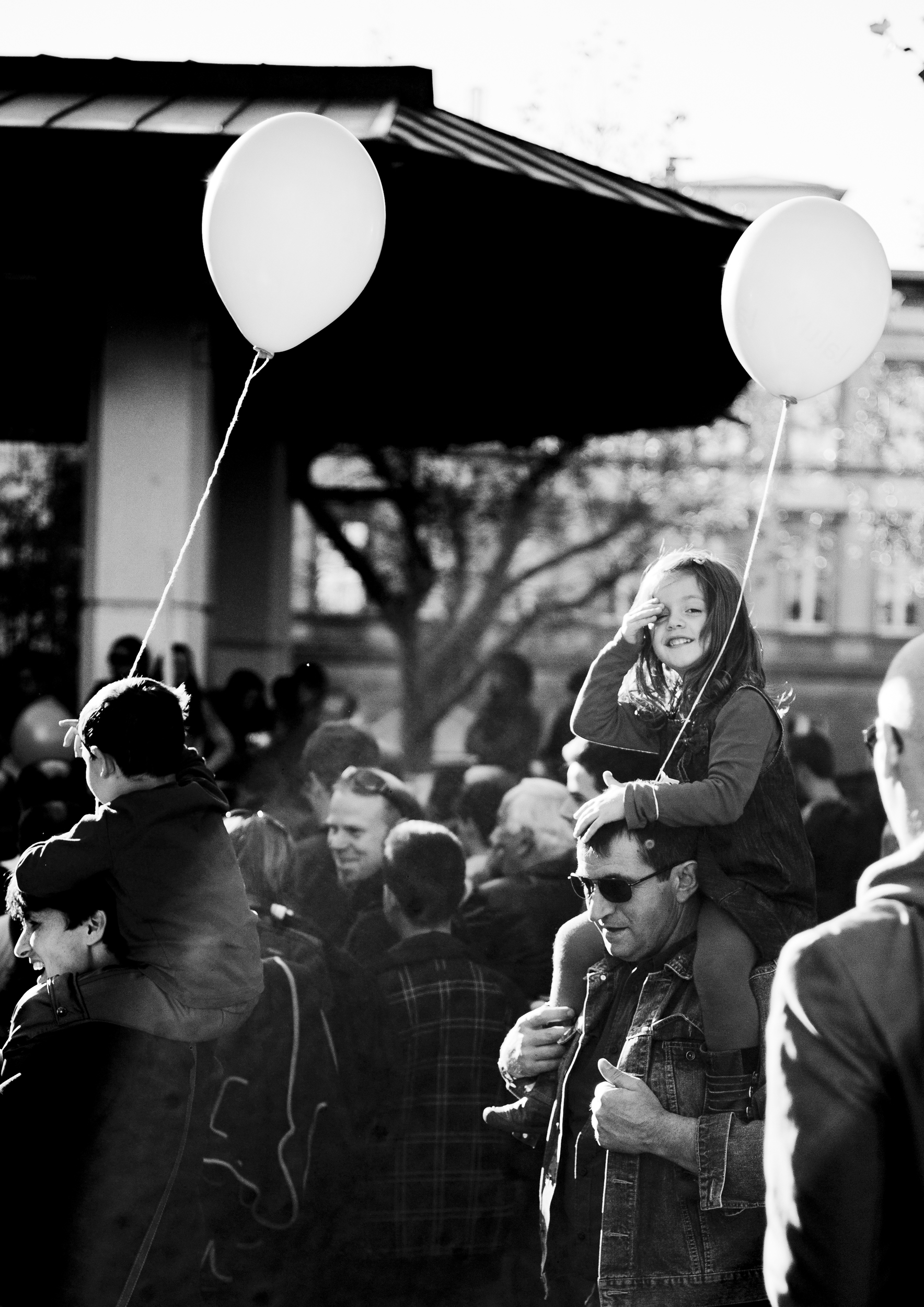 Tijdens een betoging in Luxemburg-stad zag ik dit meisje op de schouders van haar vader. Net toen ik de knop indrukte keek ze om en lachte ze.