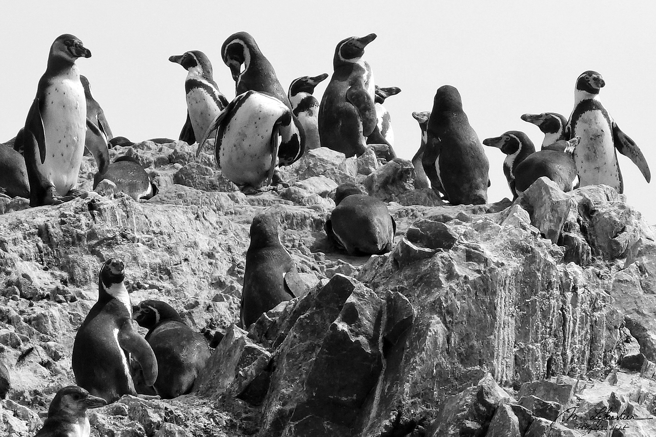 Pinguins in black & white in the Ballestas islands in Peru, called as well the mini Galapagos or Galapagos of the poor