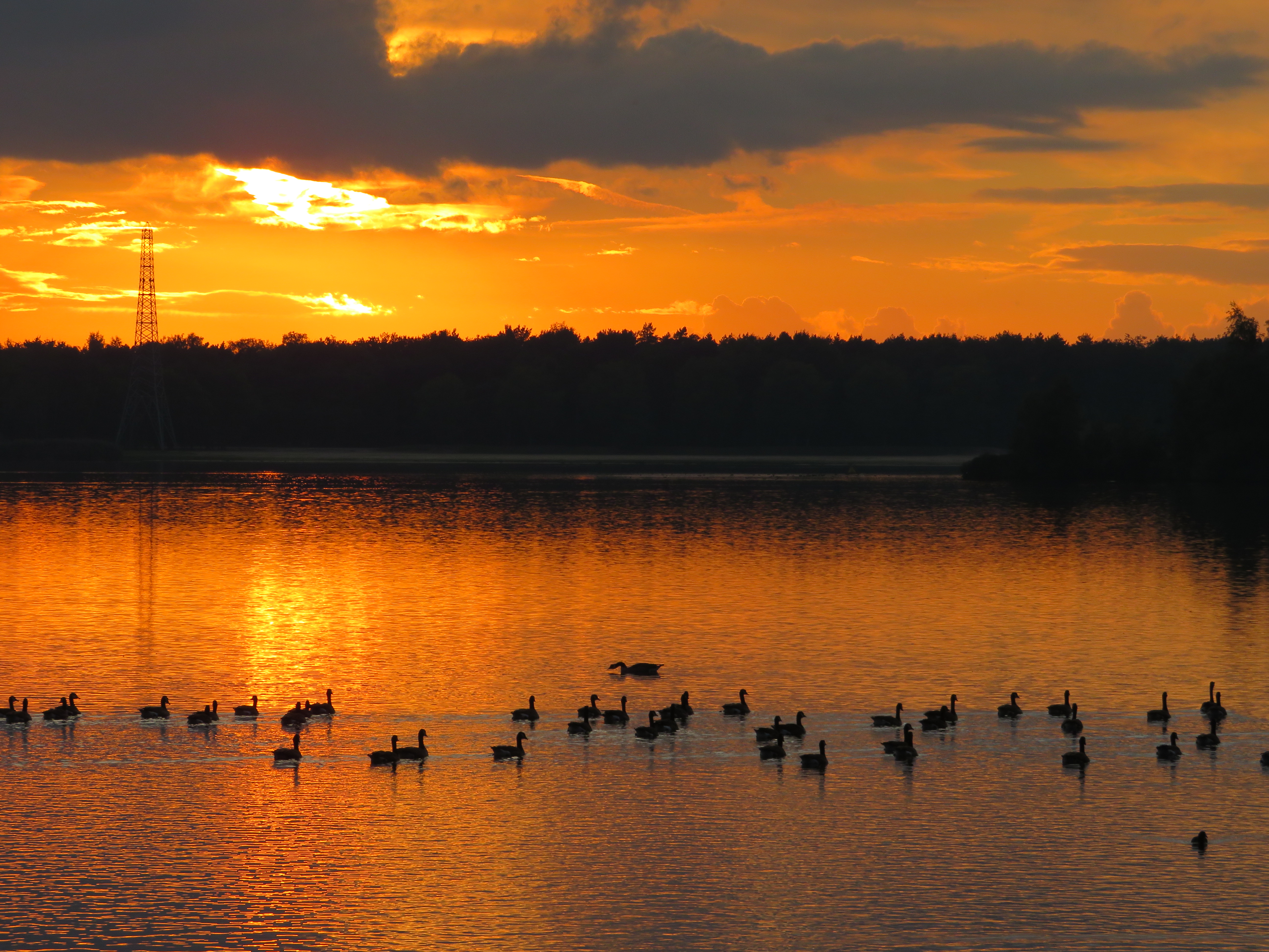 ganzen bij zonsondergang in het Victoriameer. (nazomer)