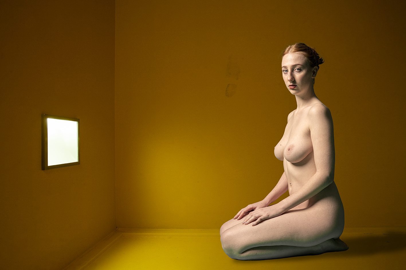 Jonge vrouw poseert geknield in een geel geschilderde ruimte