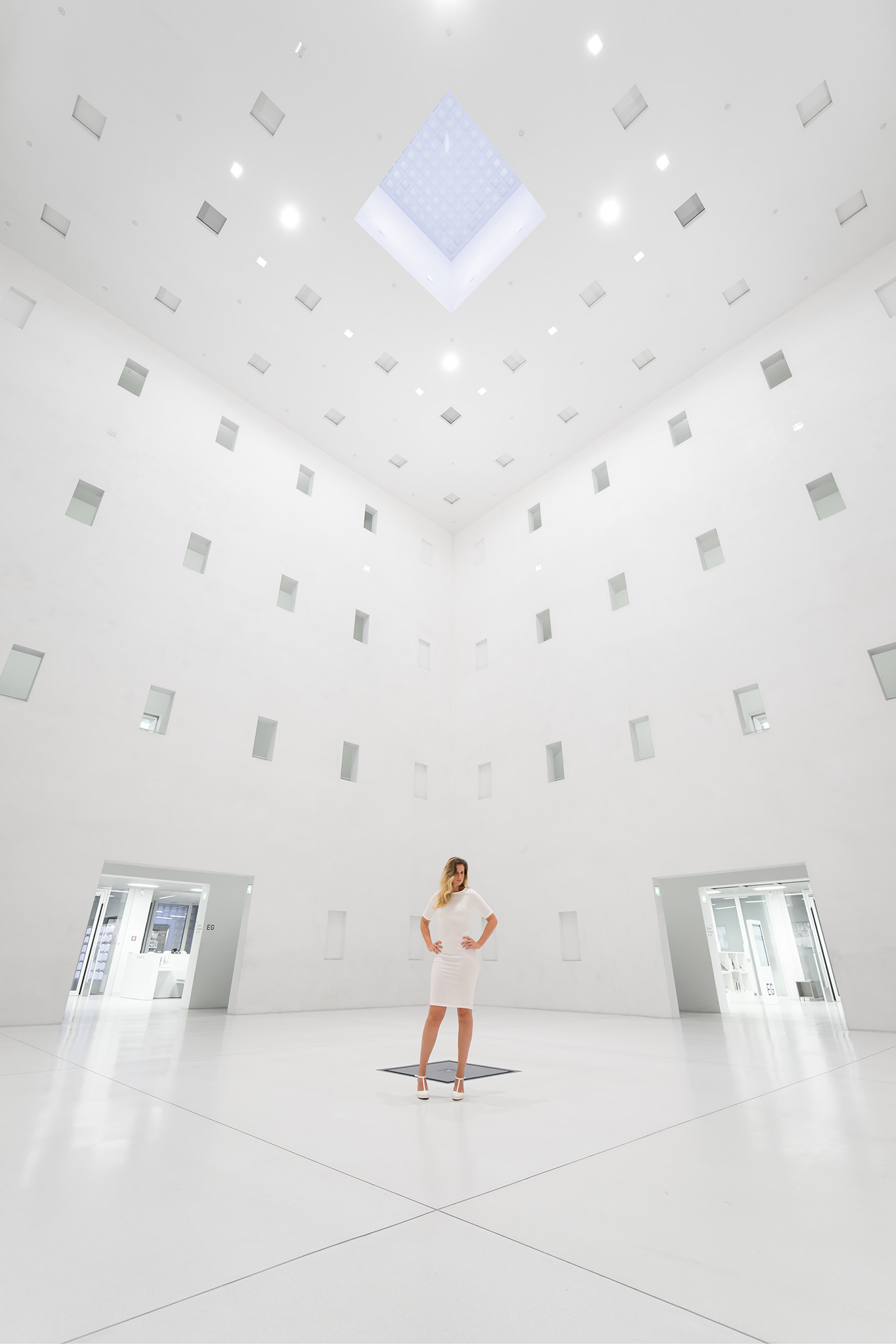 De strakke witte hal van de centrale biblitheek van Stuttgart....