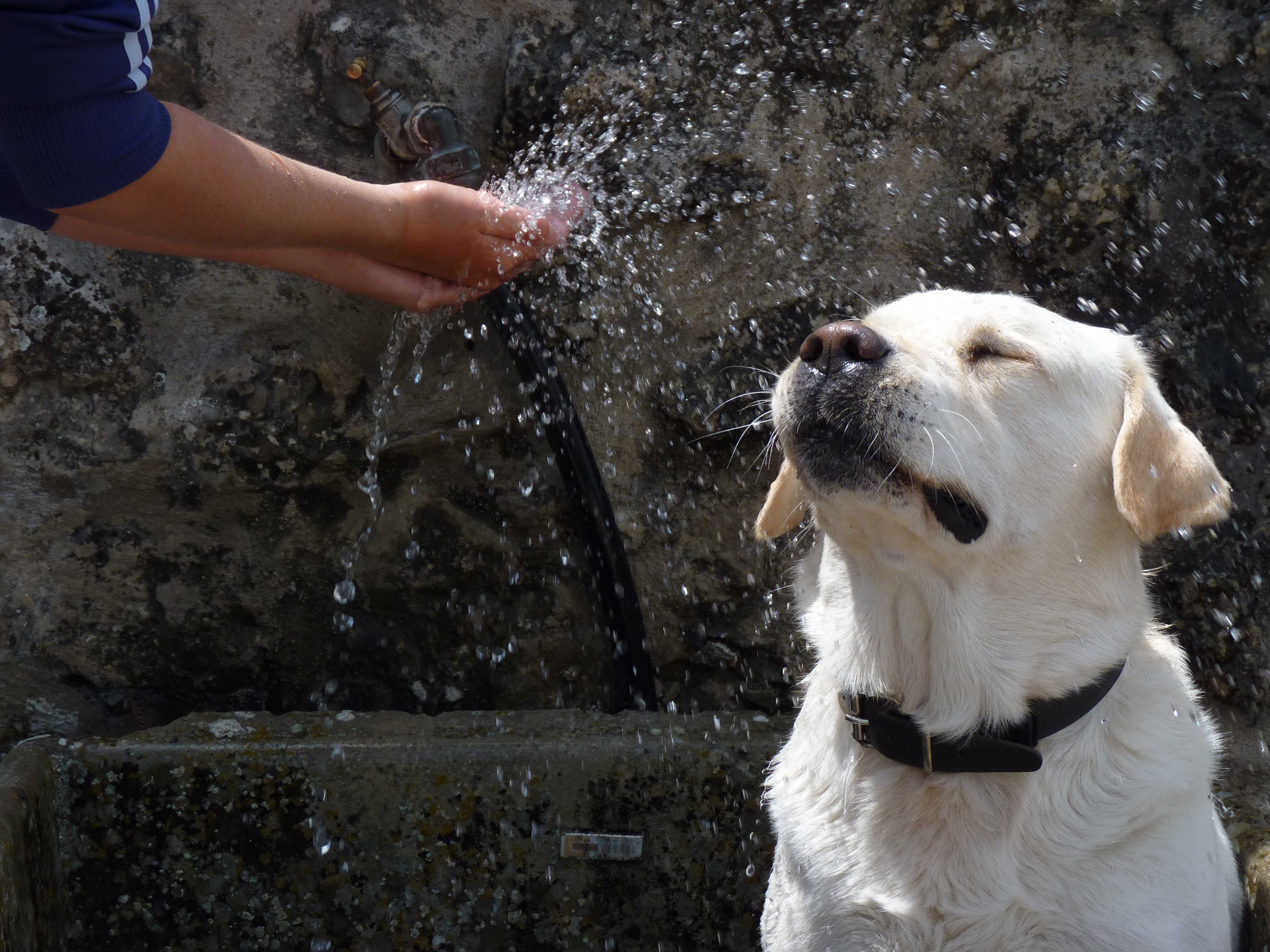 Mijn hond geniet van een verkoelende douche op vakantie.