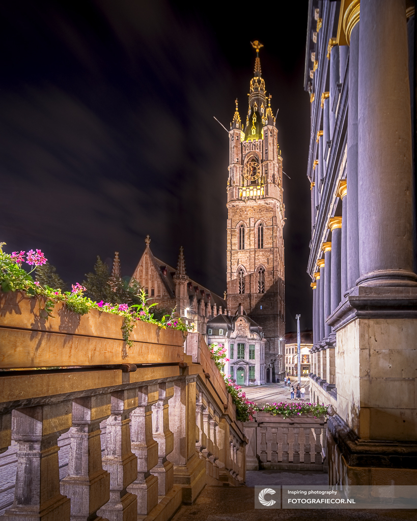 Een foto met een avondopname van het sfeervol verlichte historische stadscentrum van Gent, Vlaanderen. Het perspectief is genomen vanaf het verhoogde bordes van het stadhuis, met een duidelijk zicht op de majestueuze toren van de Sint-Baafskathedraal in het midden van het beeld. De verlichte kathedraaltoren is helder verlicht en steekt af tegen de donkere nachtelijke hemel. Op de voorgrond is een deel van het stadhuis te zien, met stenen balustrades versierd met bloeiende roze geraniums in houten bakken. Door de lange sluitertijd bewegen de wolken subtiel en dynamisch aan de nachtelijke hemel
