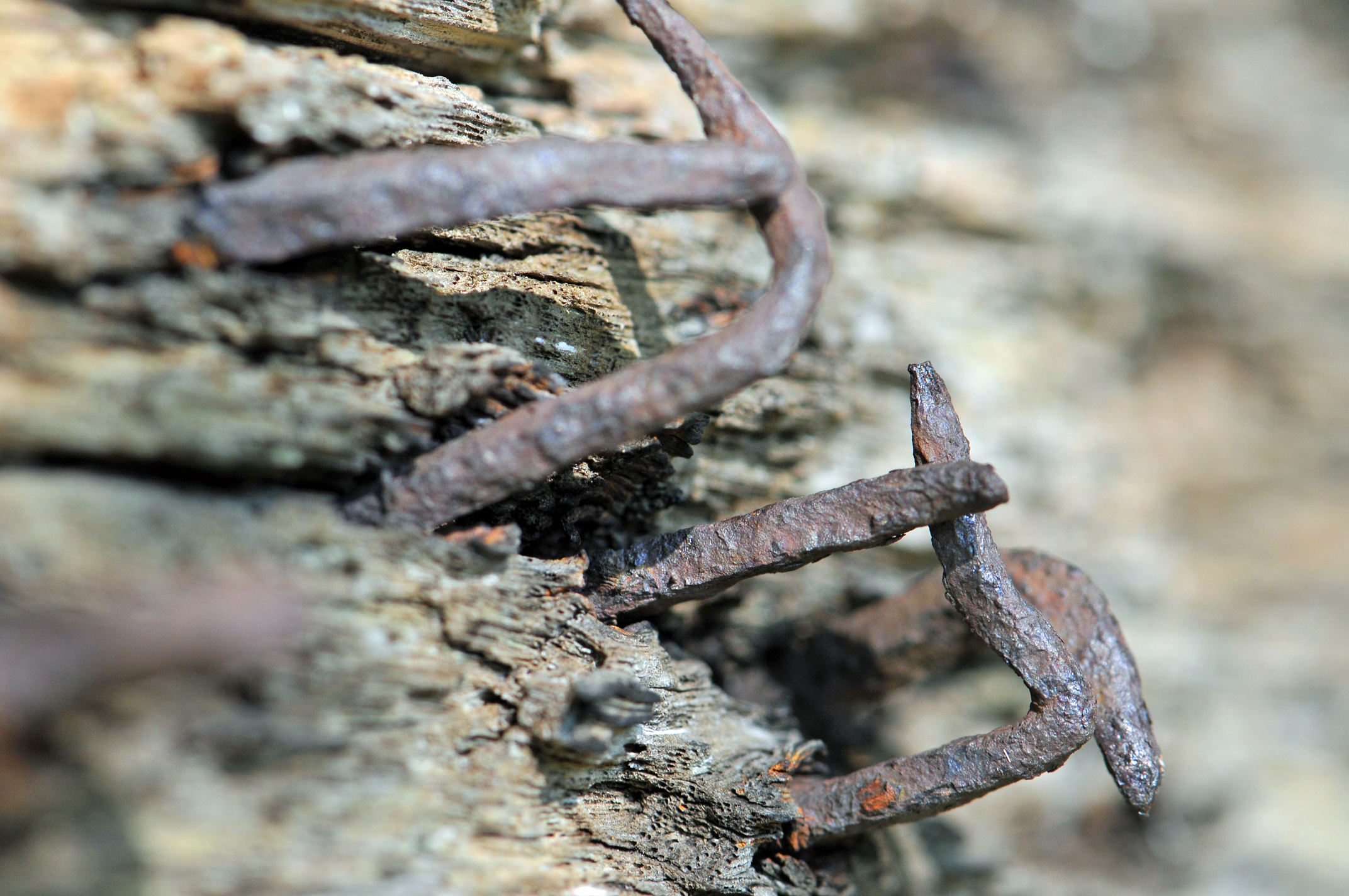 Smeedijzeren spijkers, door het hout, omgeslagen.
