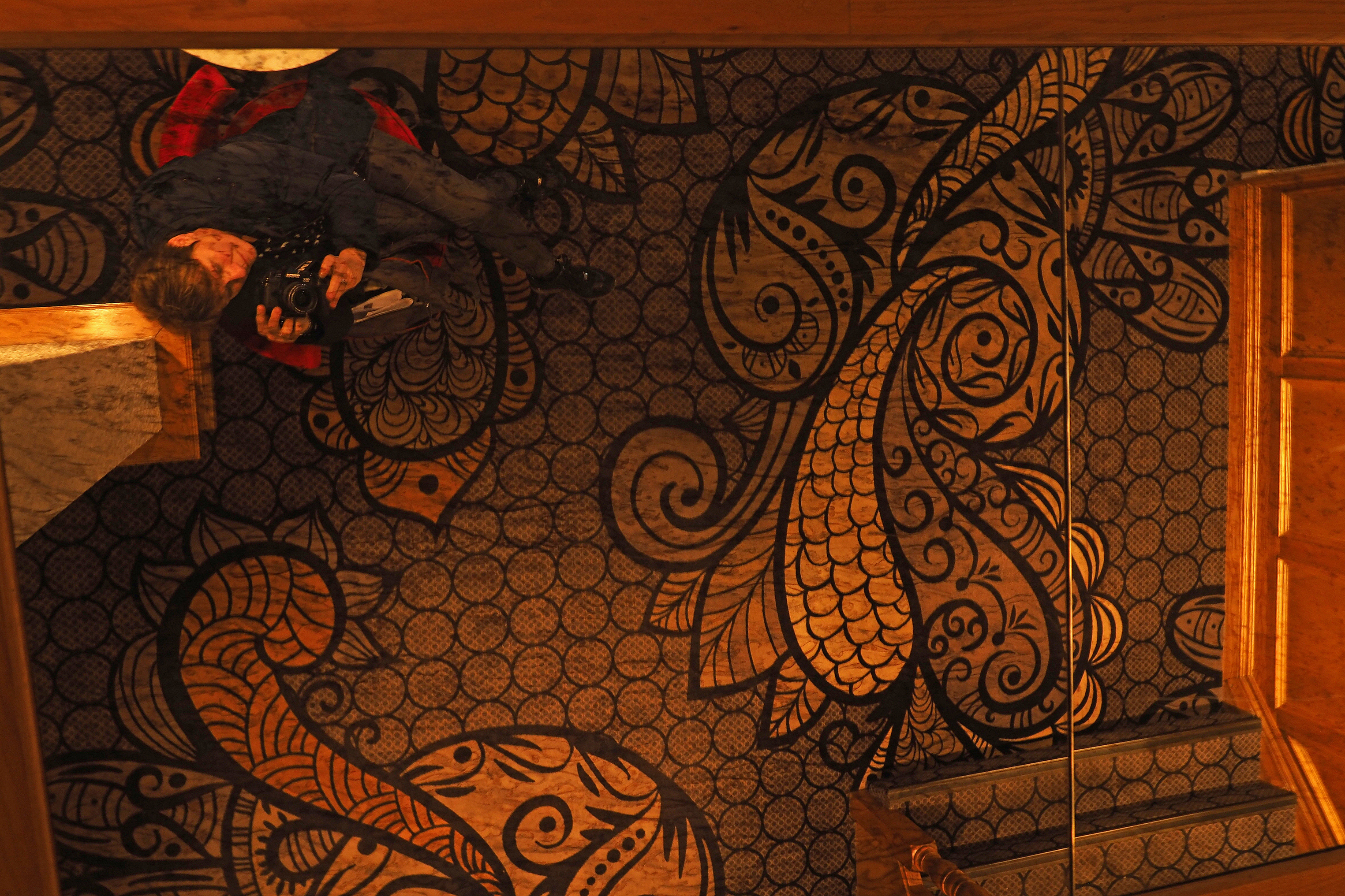 Deze foto is genomen in gang van een hotel hangt spiegel boven hooft is deze resultaat.