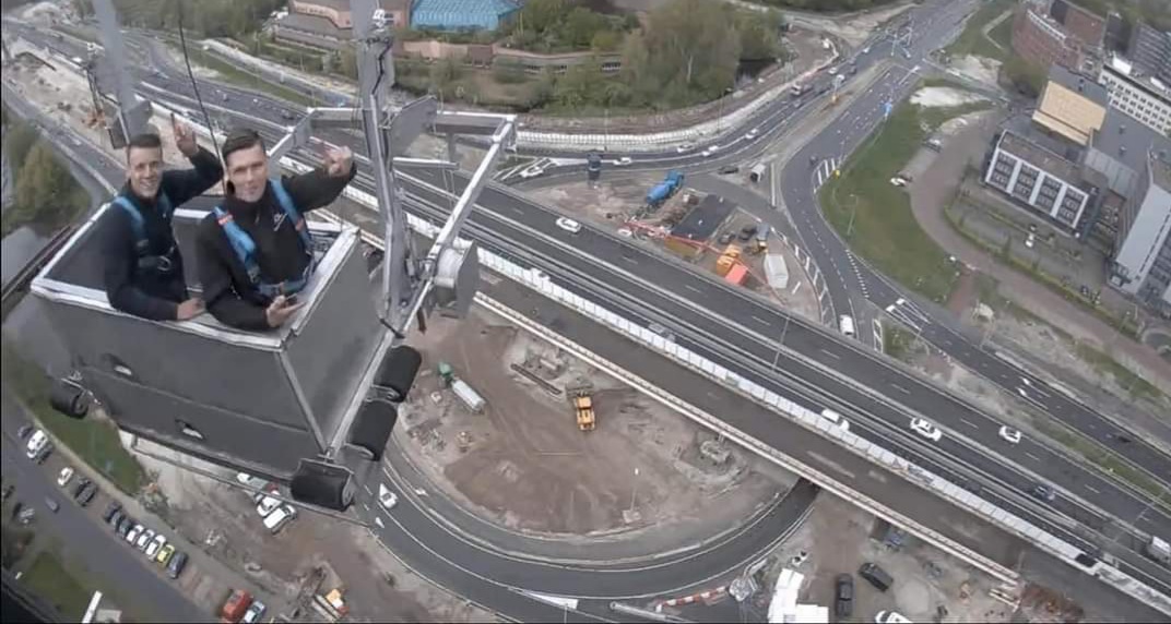 Mijn zoon met zijn collega, voor de camera van de werkzaamheden aan de weg. Tijdens het ramen wassen op hoogte.....even voor de camera