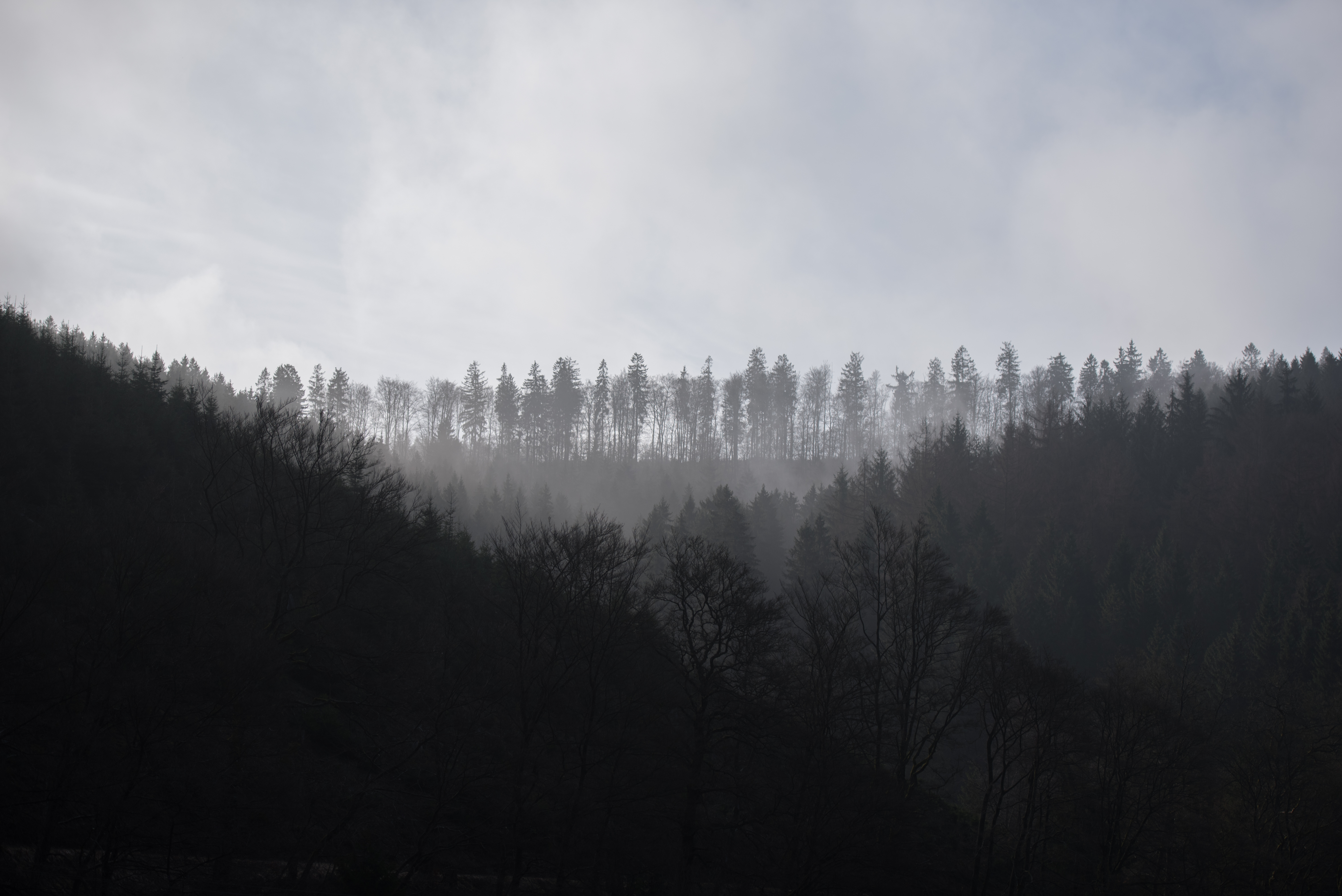 Foto is genomen in Sauerland 's-ochtends vroeg. De blauwe lucht achter de wolken komt subtiel in beeld en is m.i. een mooi contrast met de donkere bomen op de voor- en achtergrond.