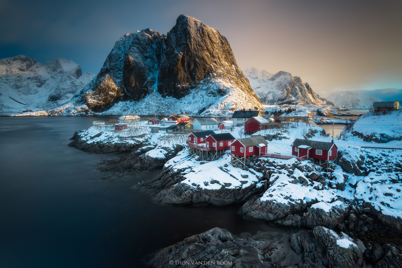 Waarschijnlijk het meest gefotografeerde dorpje op de Lofoten. De avond ervoor het weerbericht bekeken en het zou redelijk open zijn rond zonsopkomst. De andere dag dus vroeg uit de veren en hopen dat het bericht zou kloppen. En dat klopte dus... Op de achtergrond zie je de wolken die er al weer aangekropen kwamen. Kort na dit moment zat het weer helemaal dicht met regen- en sneeuwbuien.