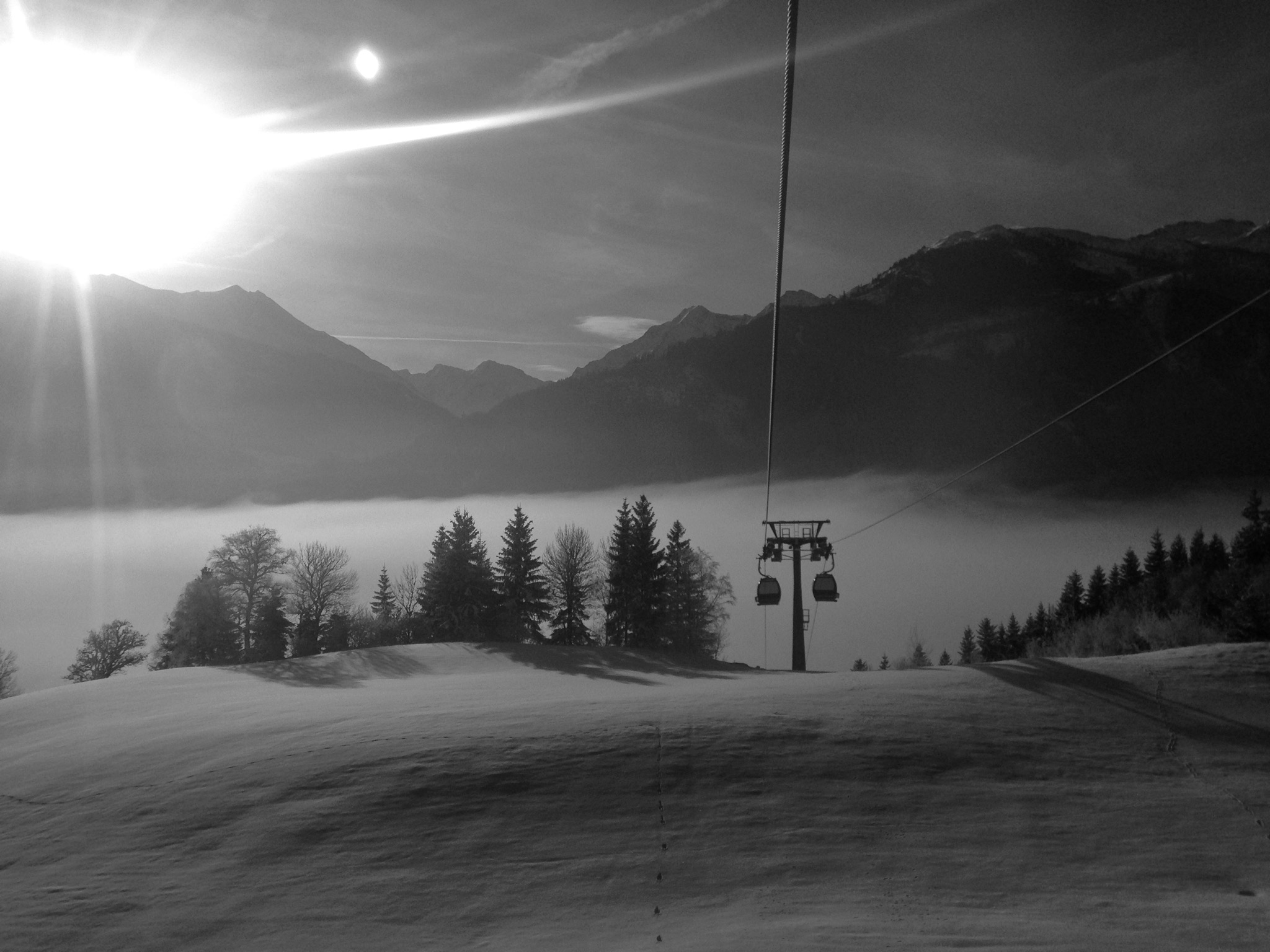 Skilift die tot boven de wolken uitkomt in Wildkogel Arena, Oostenrijk. Foto gemaakt uit de gondola.