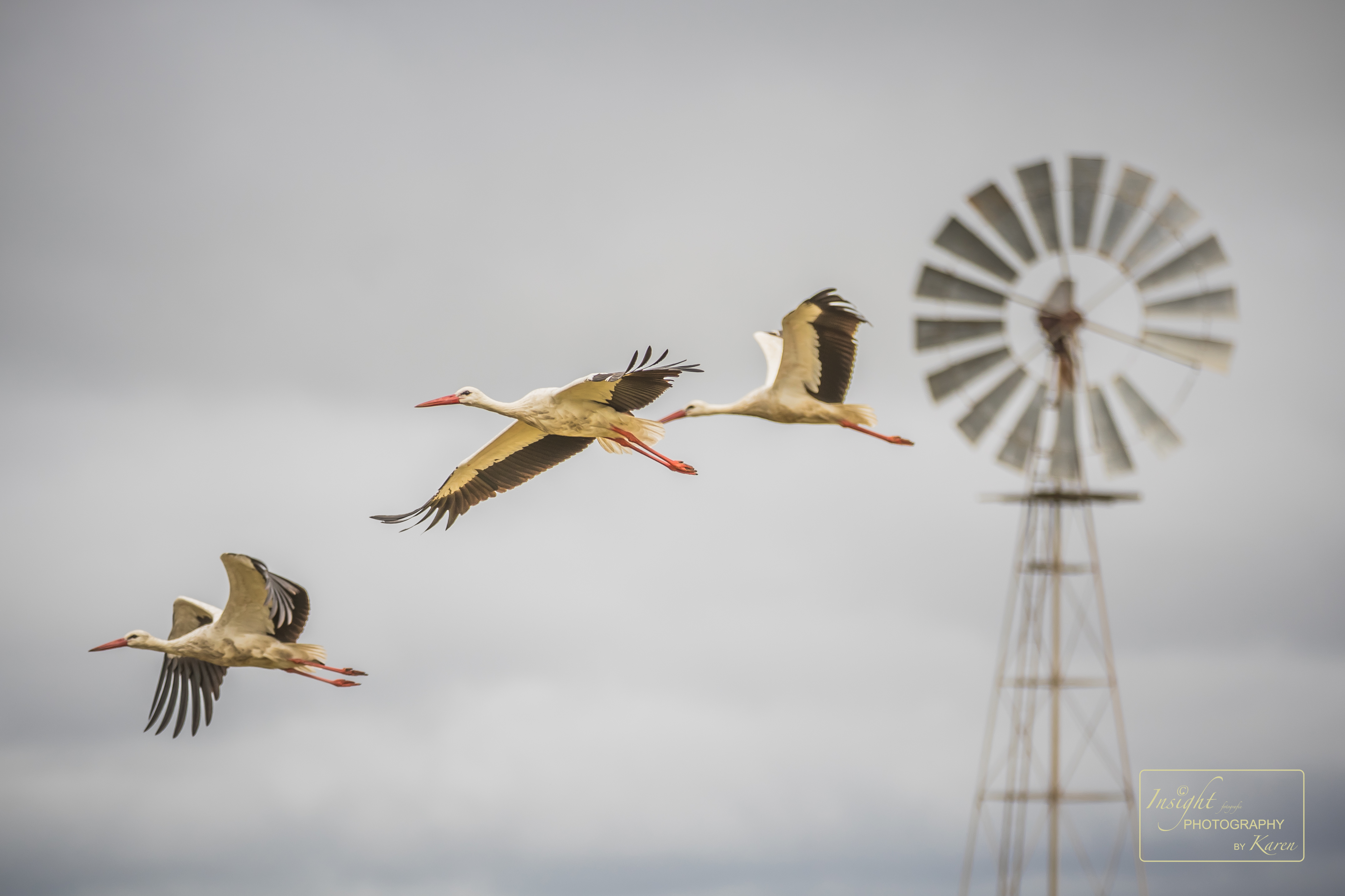 Deze foto is onderdeel van mijn serie: The Art of Wildlife. White storks against the grey morning skies in Krugerpark, South Africa