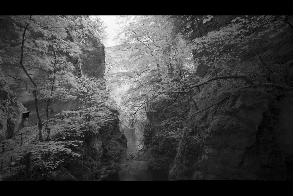 Taken in Switzerland during a beautiful walk at the Gorges de l'Areuse in the Val de Travers area. I had to strap my camera to a railing using my belt because i didn't bring my tripod along this walk. Hoya R72 infrared filter, ISO 50, f8, 30 seconds.
