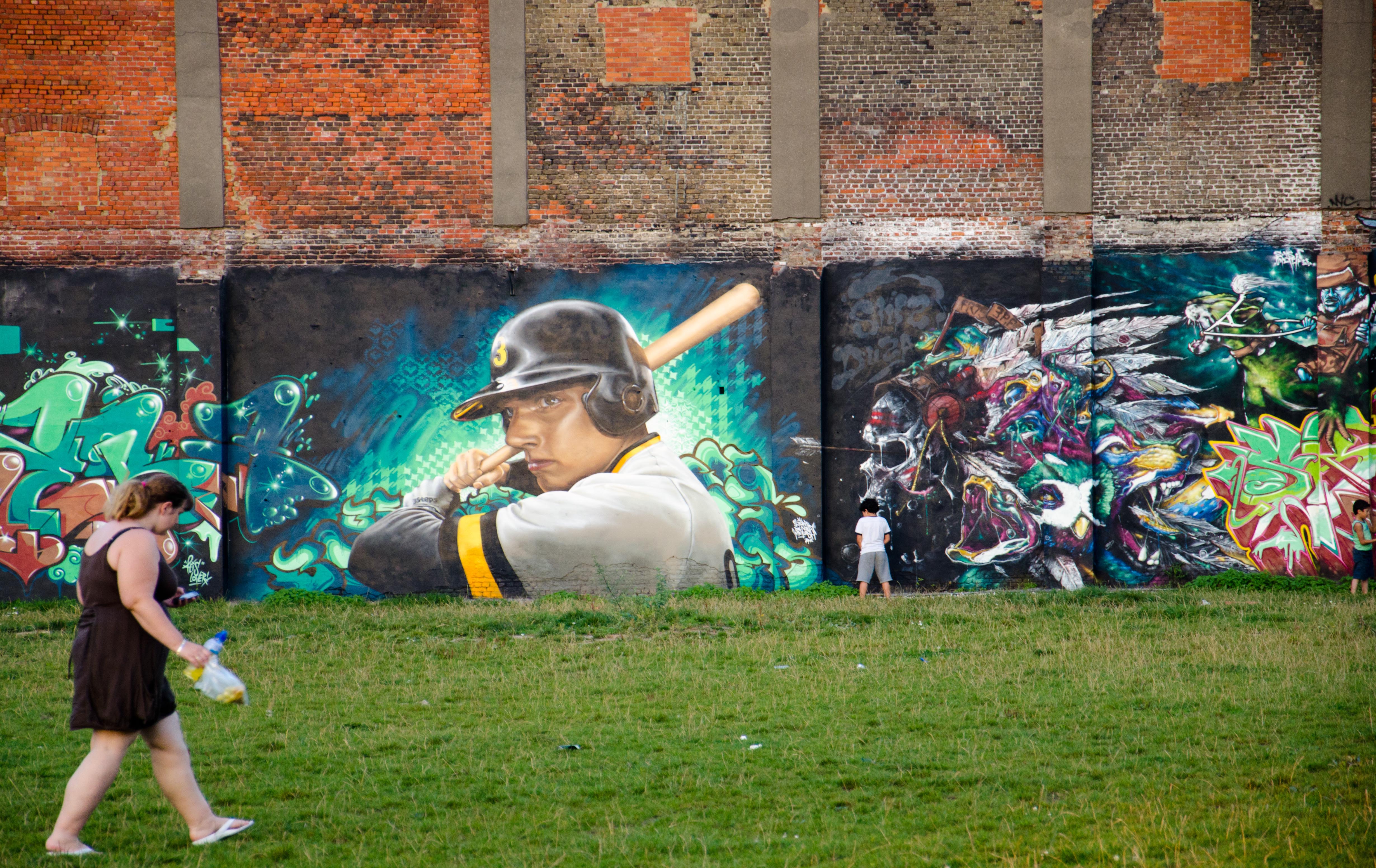 Art graffiti op een wand van een verhoogde verkeersweg in Antwerpen