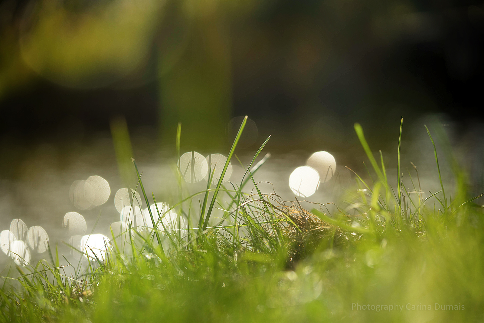 Simpele grassprietjes aan de waterkant, reflectie zon.