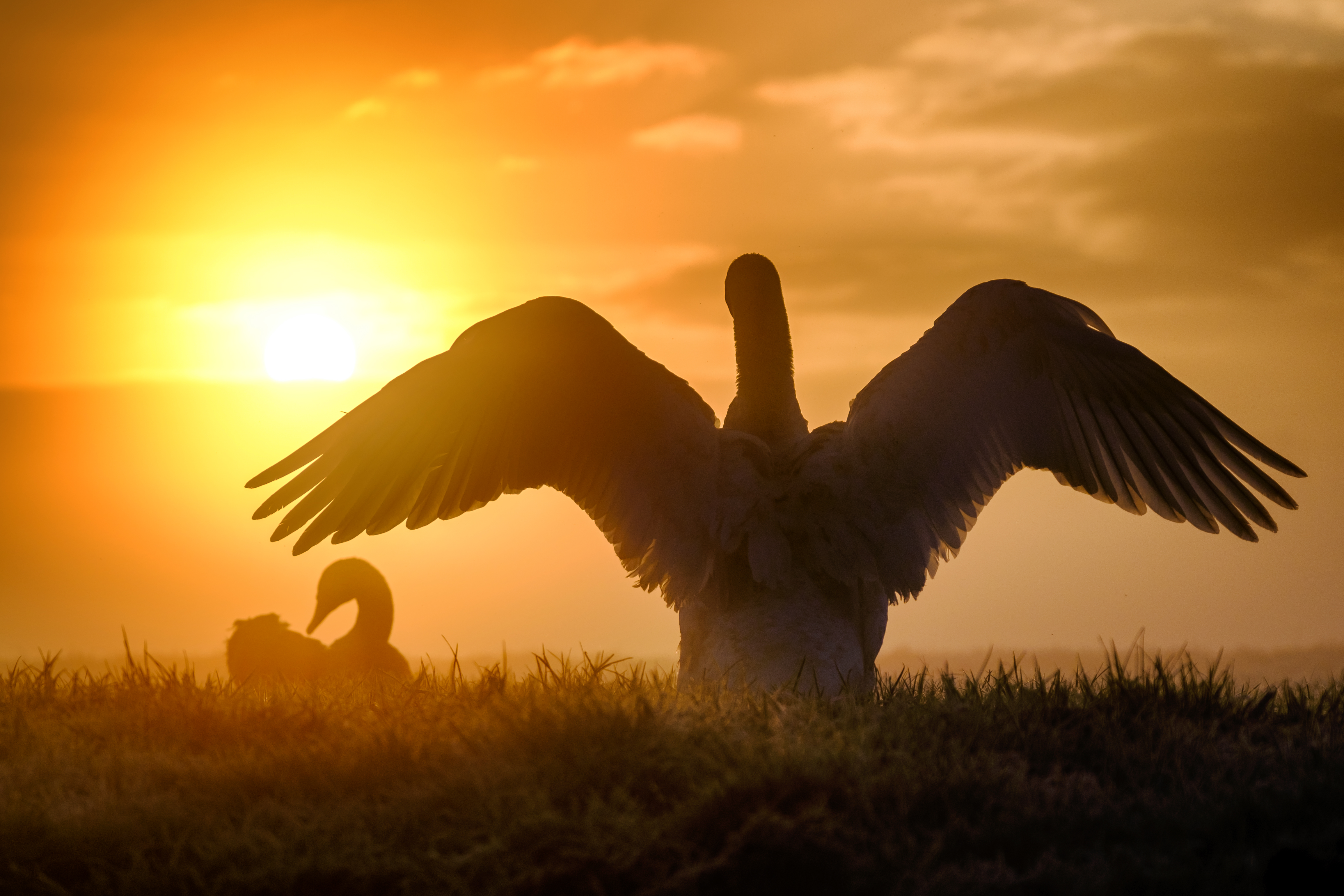 Een familie zwanen lag in de polders van Leiderdorp de warmte van de zon af te wachten. Naarmate de zon hoger kwam werden ze wat actiever. Deze zwaan vond het tijd zijn vleugels te warmen.