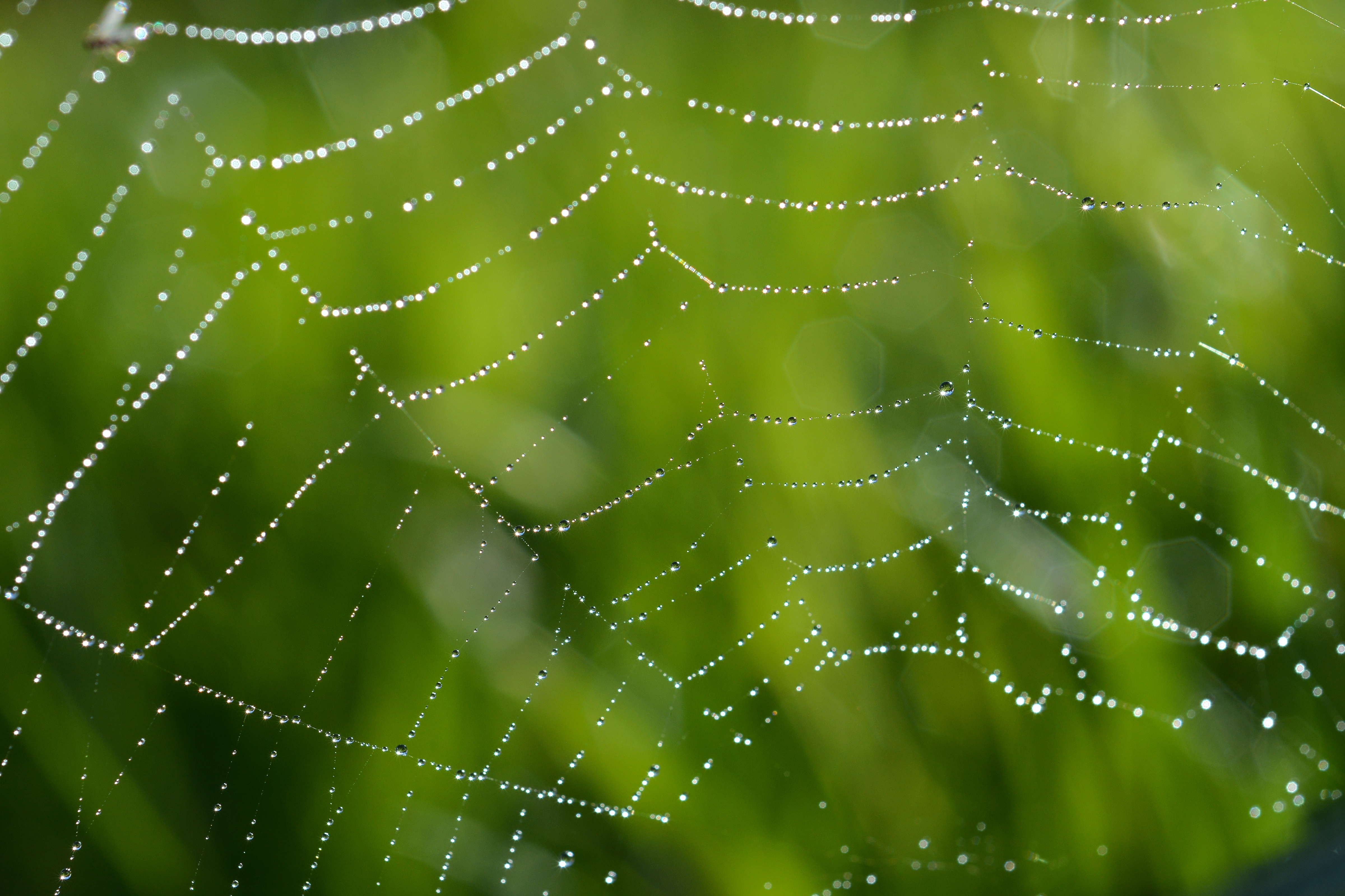 Druppels in het spinnenweb met een morgenzon en mooie frisse groene kleuren .