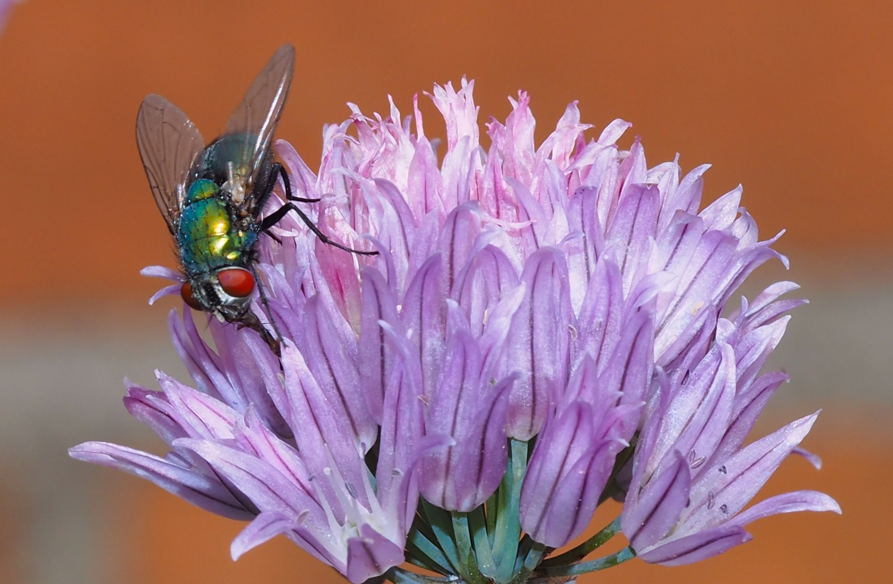 Groene vleesvlieg op Bieslookbloei