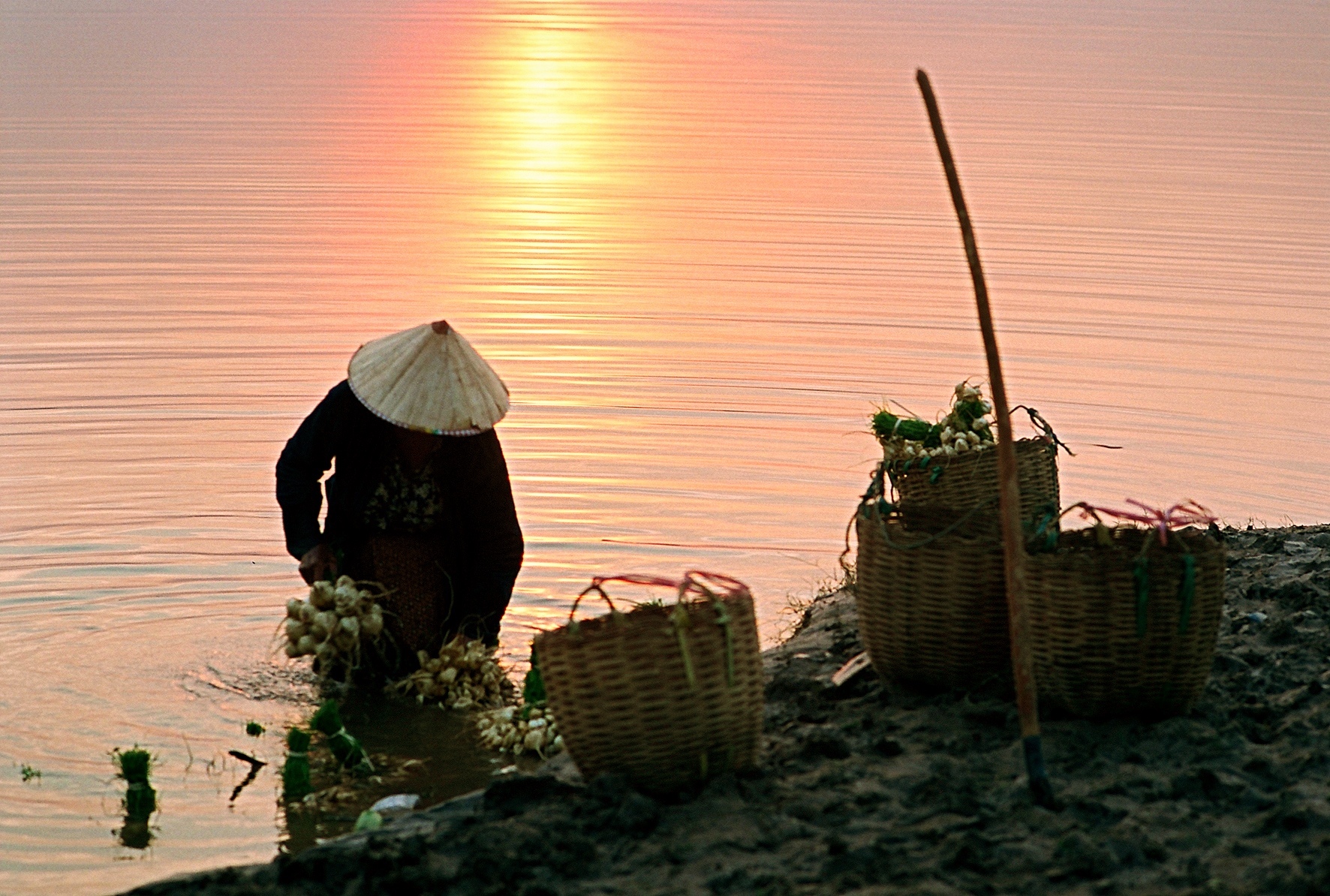 Groente wassen in de mekong rivier in Vientianne te Laos
