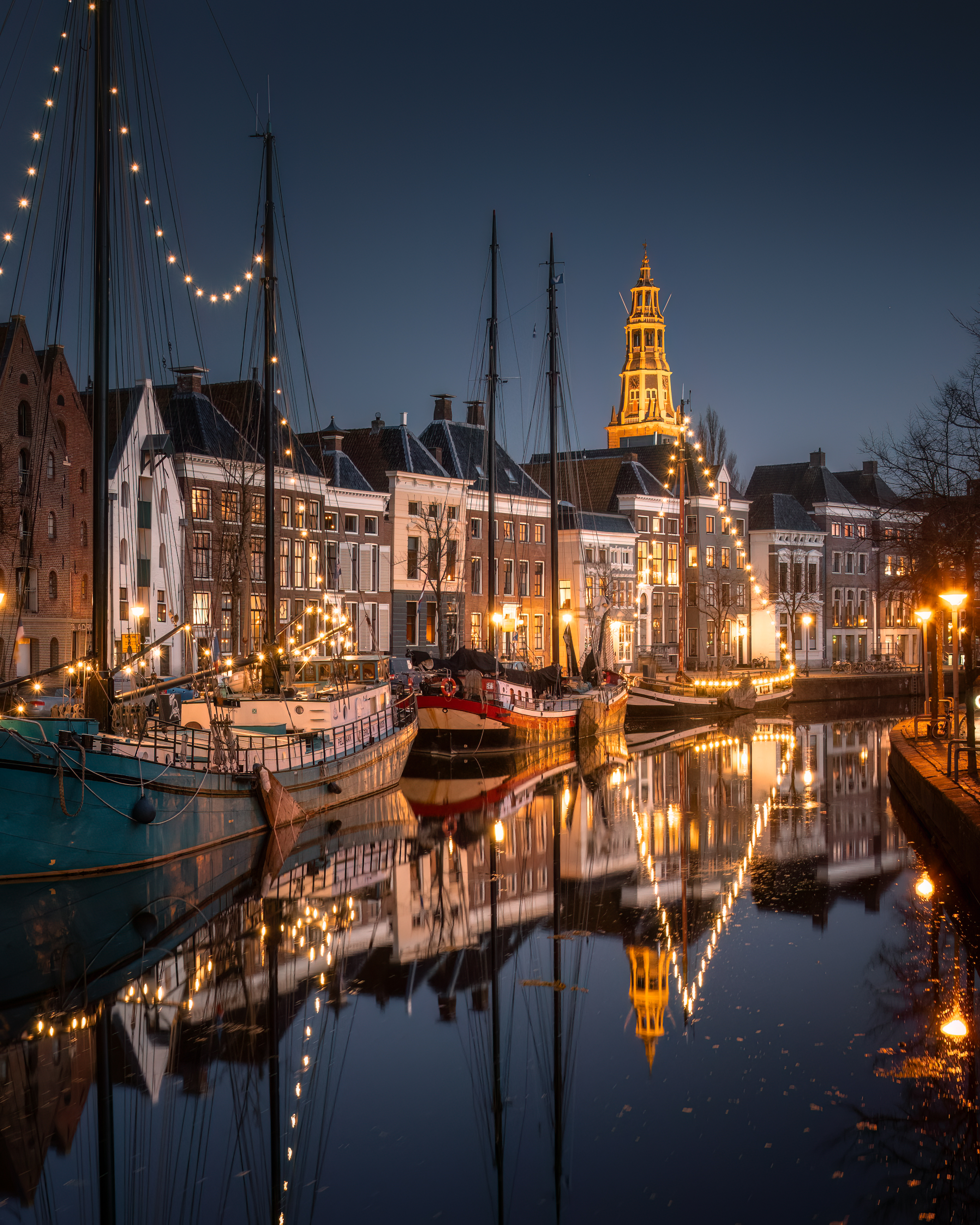 Groningen tijdens de kerstdagen. Ik heb deze foto vanaf een brug genomen. Het was windstil en met een polarisatiefilter kon ik een goede reflectie krijgen. De bootjes die verlicht zijn geven een extra mooie sfeer met deze dagen.