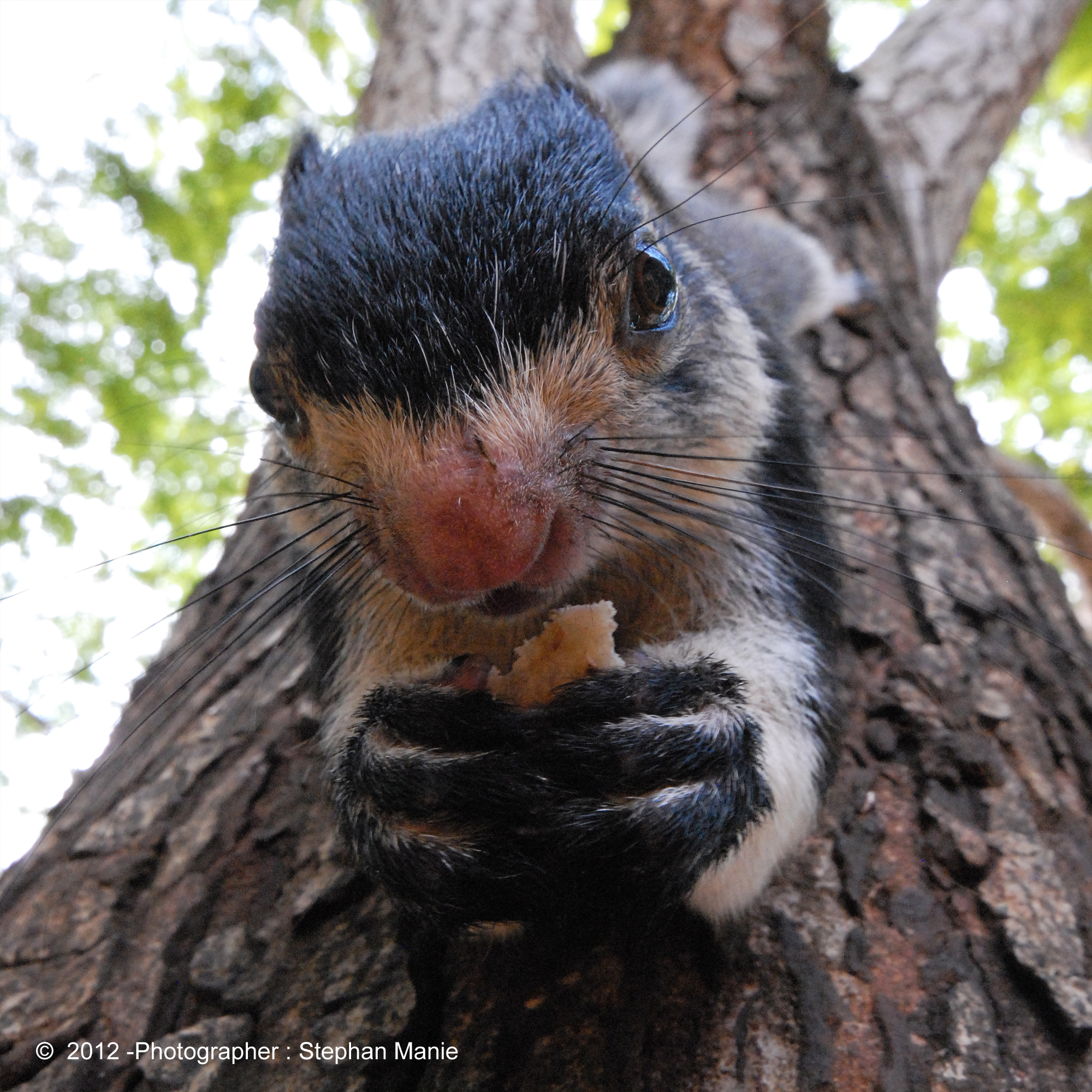 Tijdens onze klimtocht op de leeuwenrots in Sirigia zien we een Ratufa Macroura; een Sri Lankaanse reuzen eekhoorn die ons nieuwsgierig aankijkt. Mijn camera met een 10mm groothoek bevestig ik aan de boomstam en heb wat broodkruimels op de body gelegd. Ondertussen genieten we van het uitzicht en pauzeren we even, aangezien ons nog een hele klim wacht.