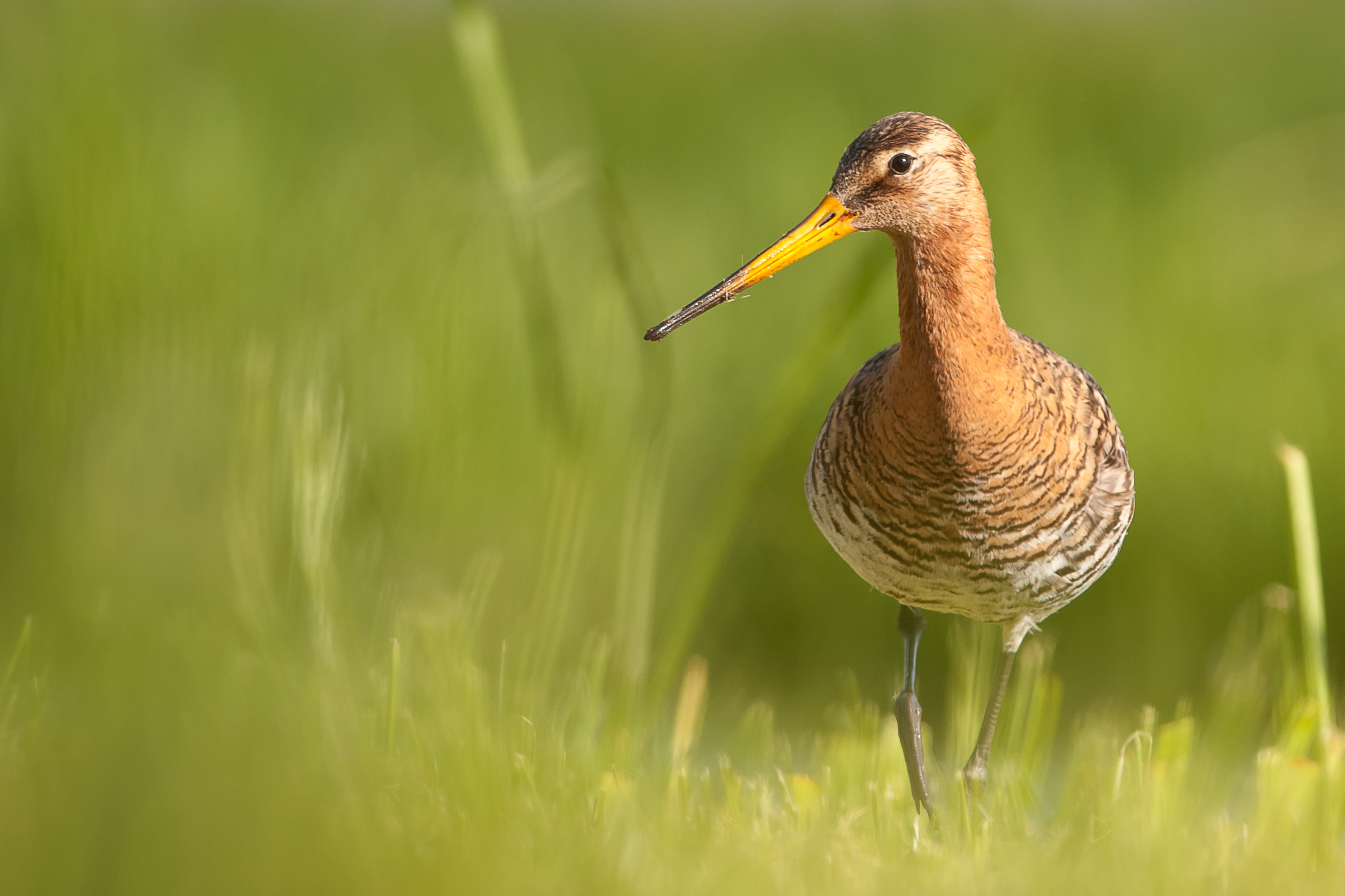 Dit is alweer een foto uit april. De grutto kwam aanvliegen en praktisch voor mij landen, ik hoefde alleen nog maar te gaan liggen. Hij begon rustig in de aarde te wroeten.