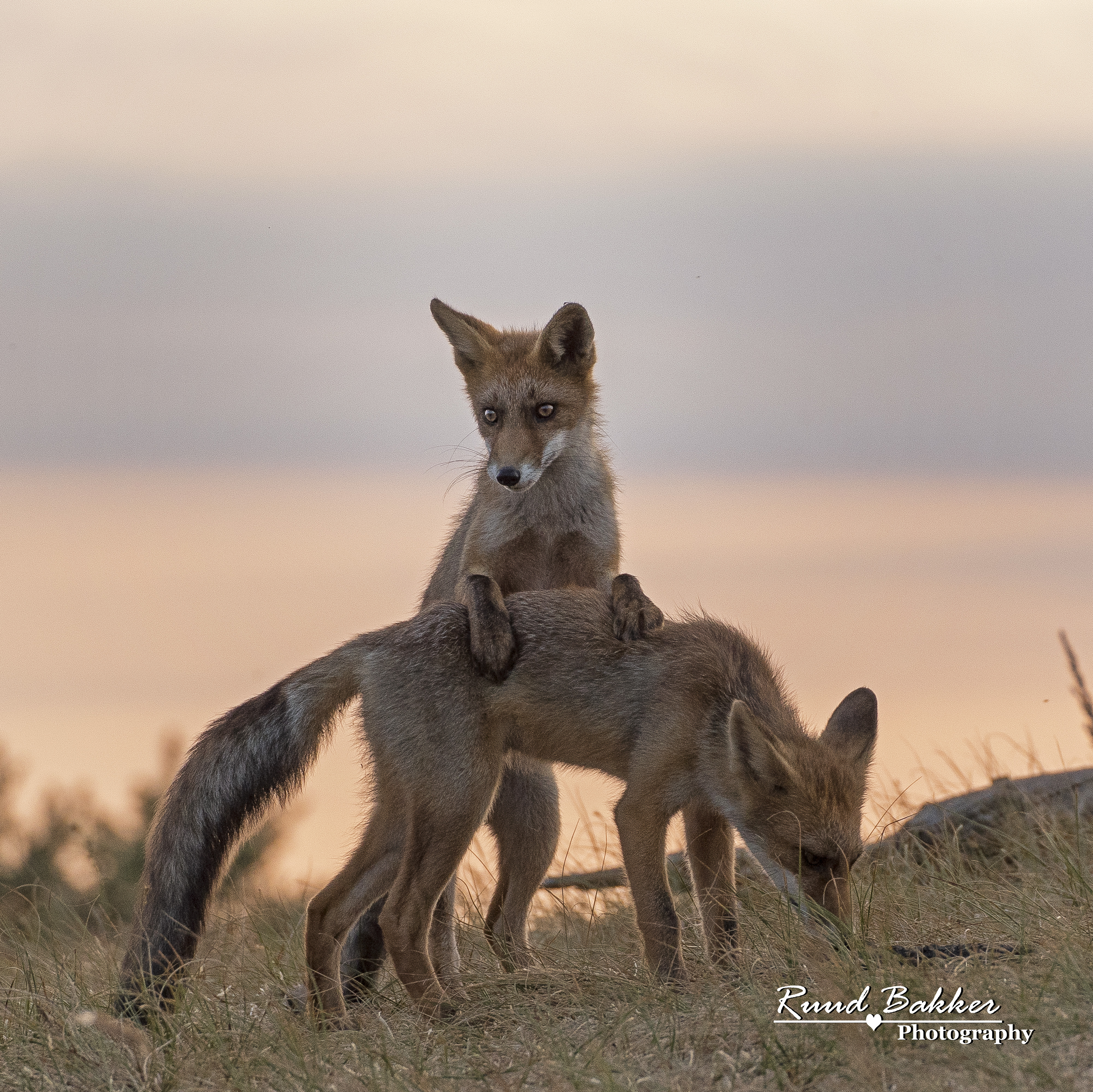Twee jonge vosjes die lekker aan het spelen zijn met elkaar.