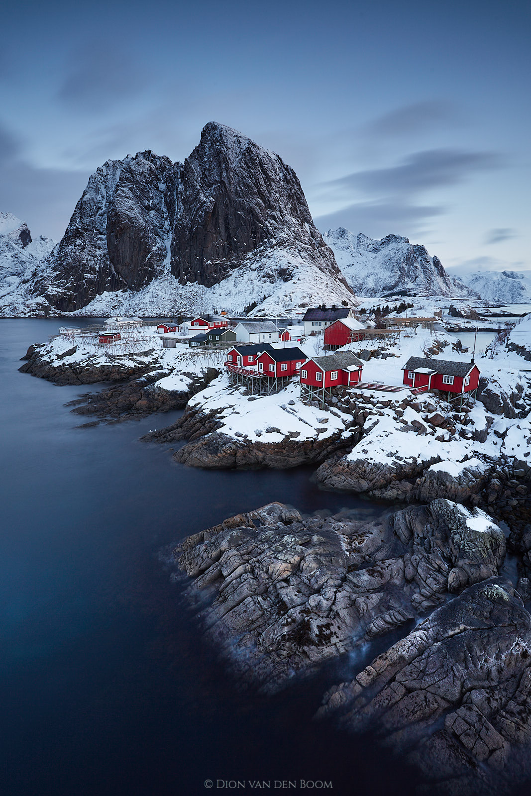 Het idyllische dorpje Hamnøy op de Lofoten in Noorwegen tijdens het blauwe uur. De voorspellingen de avond ervoor gaven een opklaring precies rond zonsopkomst. Dit is ongeveer een kwartier voor de zon boven de horizon kwam.