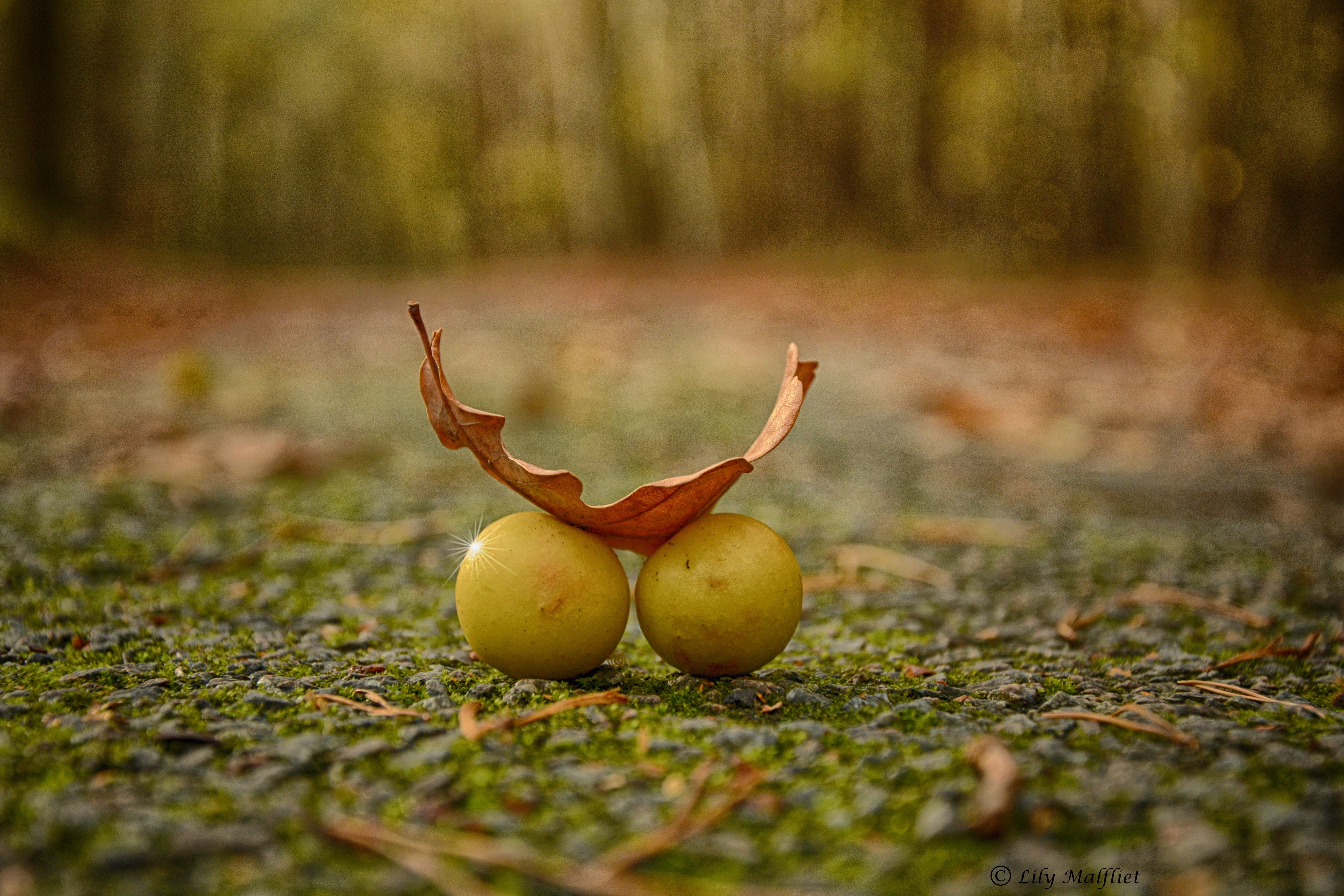 Deze galappeltjes lagen samen gekleefd onder een eikenblad langs onze oprit. Waren echt zo, niet gemanipuleerd. Nog nooit zo gezien. Heb ze, nadat ik de foto genomen had, opzij gelegd, want ik zou het jammer vinden als er overheen zou worden gereden.