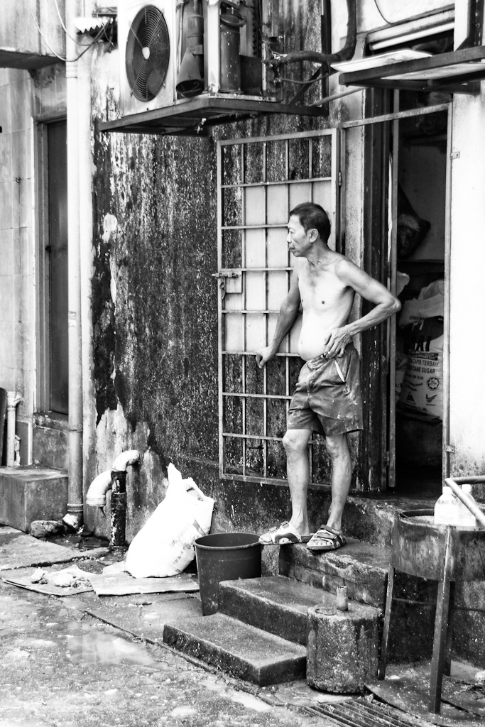 Liep door een straat in Kuala Lumpur en zag deze man een pauze nemen na hard werken in de keuken van een restaurant. Gelijk de kans genomen om dat vast te leggen.