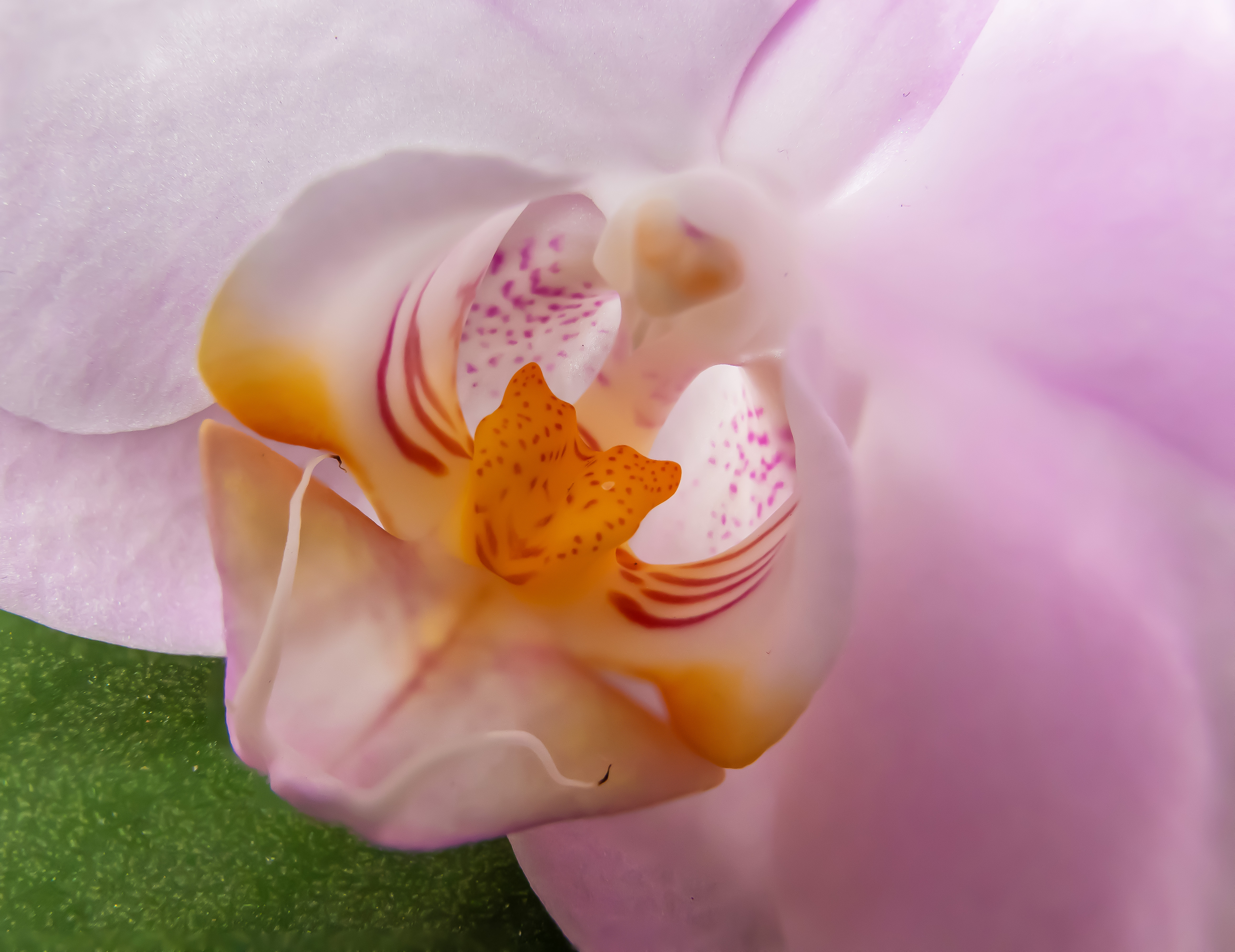 Hierbij een close-up van een hart van een roze orchidee.