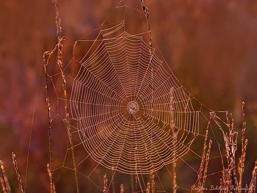Vroeg opstaan loont.... Deze prachtig verlichte webben zijn dan de zichtbare sieraden. De achtergrond bestaat uit heide.