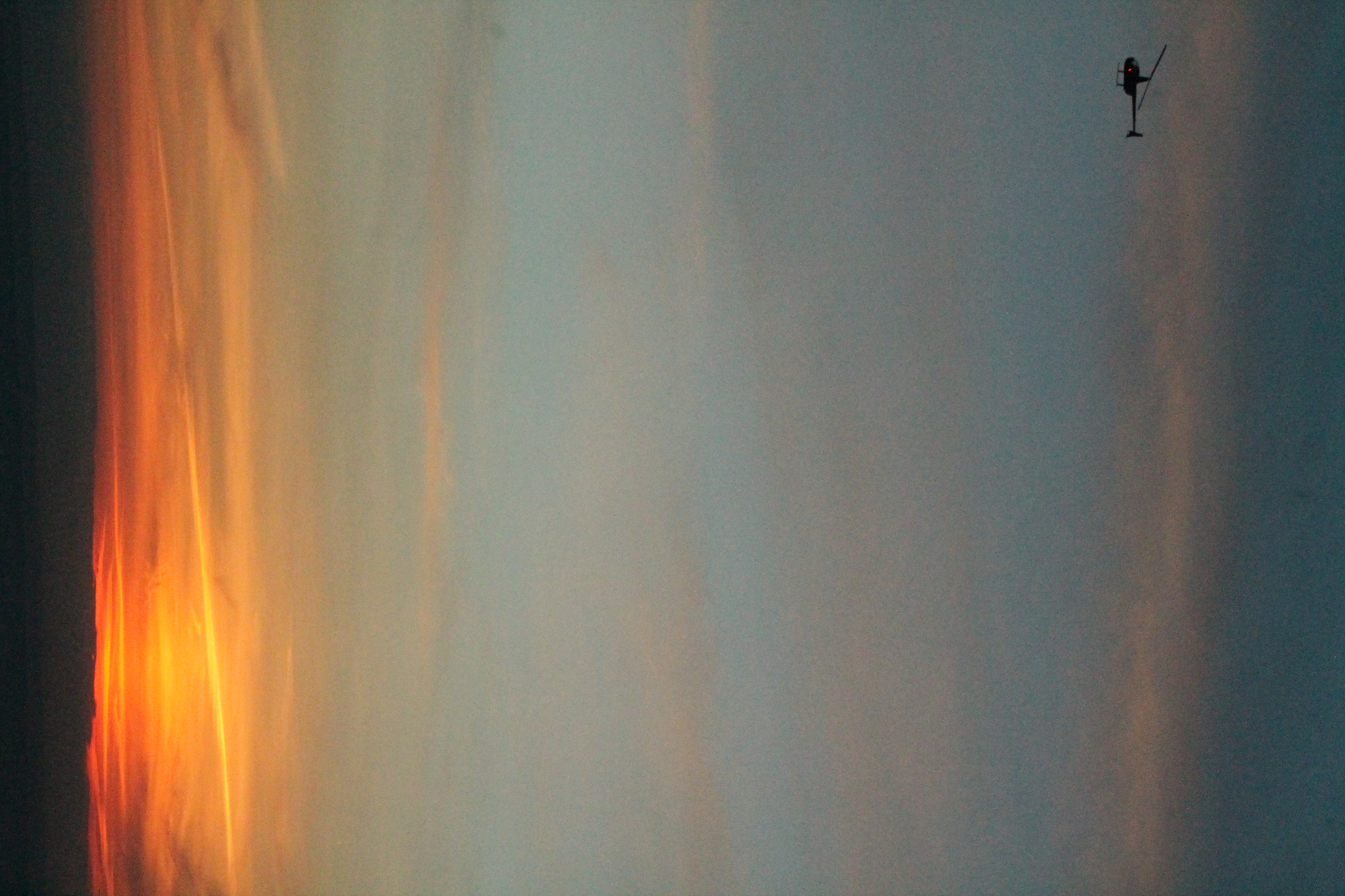 Genomen in New York vanaf One World Observatory. De helikopter tegenover de prachtige kleuren van een zonsondergang, technologie vermengd met natuur.