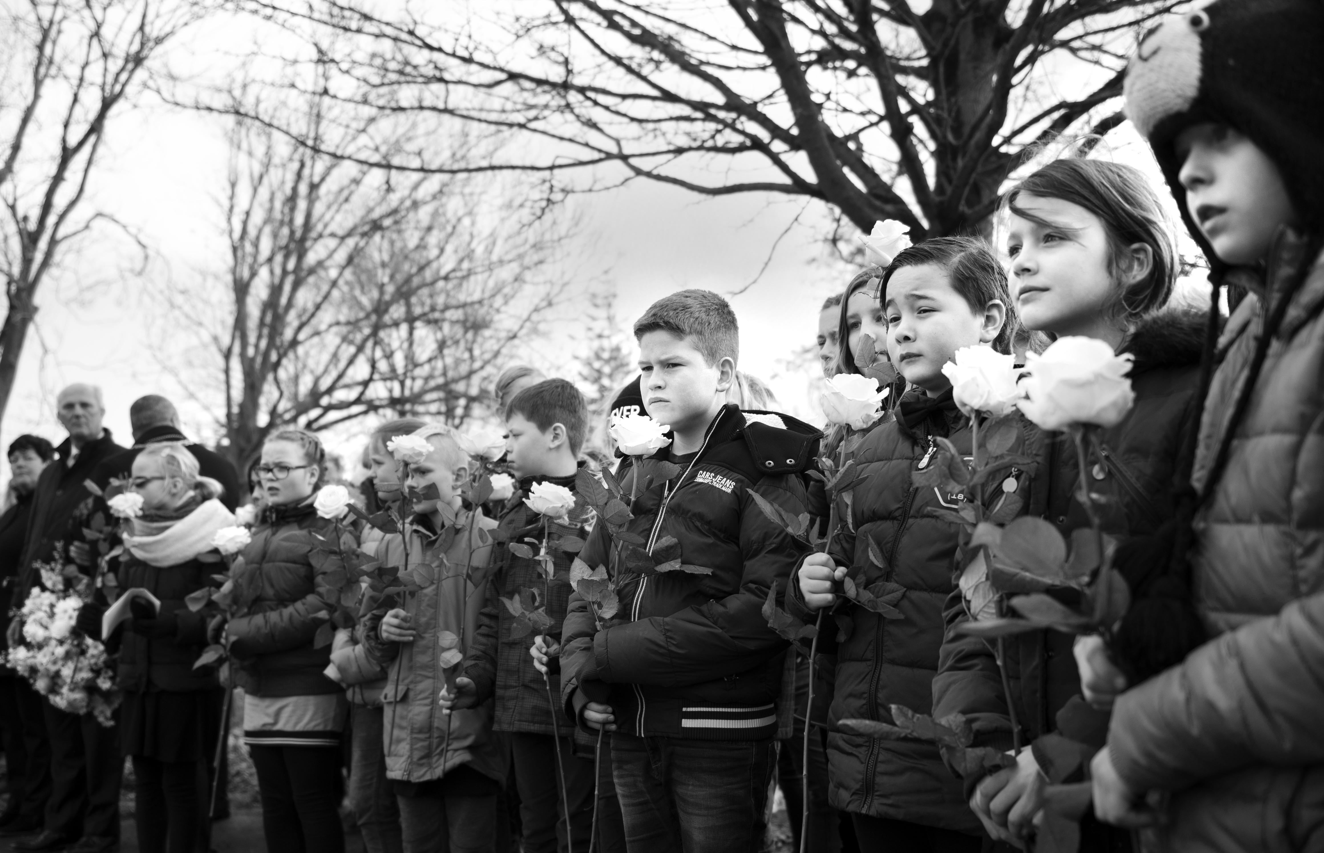 Serieuze, droevige blikken bij leerlingen van groep 7 en 8 van basisschool de Zuidvliet in Kortgene bij de herdenking van de Watersnoodramp.