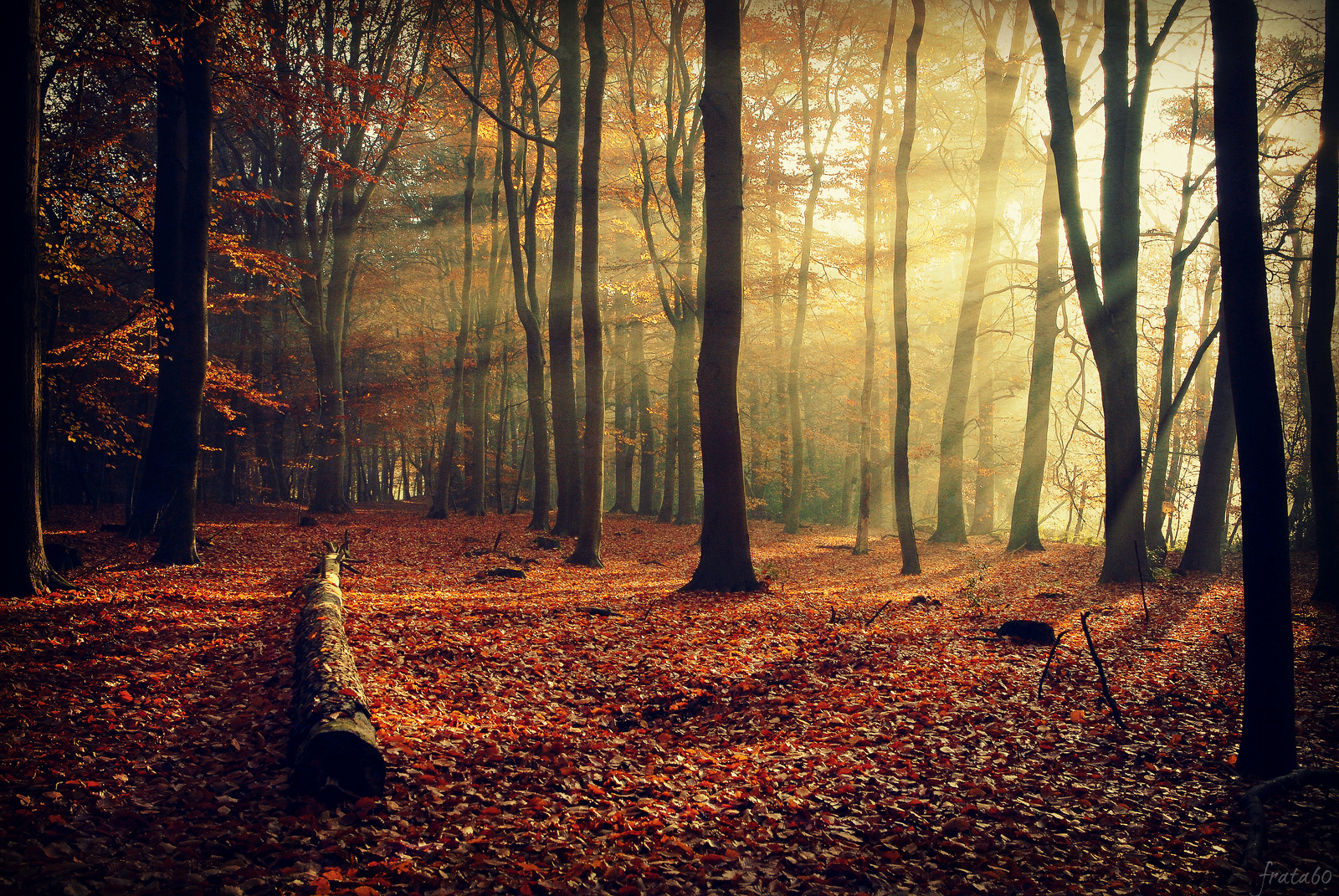 Ik zag deze zonnestralen op een schitterende wijze door de bomen klieven en het breekpunt in dit moment was de dode liggende boom tussen alle staande en levende in.