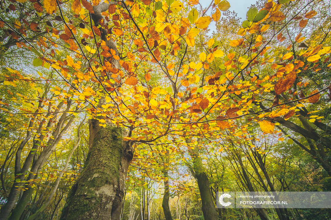 Op het eerste oog een ogenschijnlijk gewone tak die aan een boom hangt net als zovelen in het enorme beukenbos op de Veluwe. wie eronder kruipt ervaart een hele andere beleving en is het net of er een grote paraplu met fleurige kleuren over je heen hangt. Wat klein en normaal leek wordt opeens groot en imposant en zeker als je met een 15 mm groothoek in de weer gaat ;-)