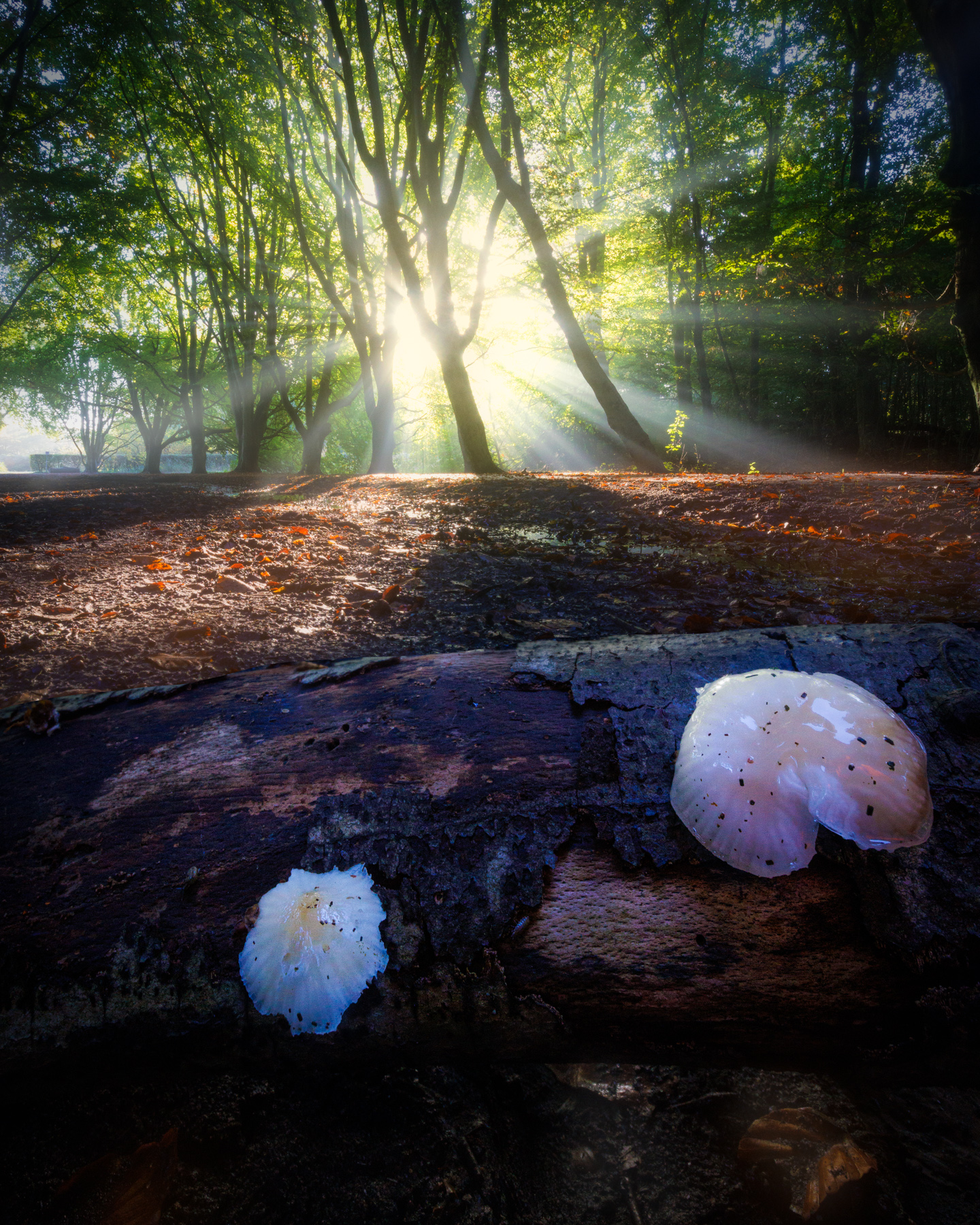 Zo mooi om zowel zonneharpen als paddestoelen te combineren. Deze foto is een focus stack met wide angle lens in het Amsterdamse Bos.