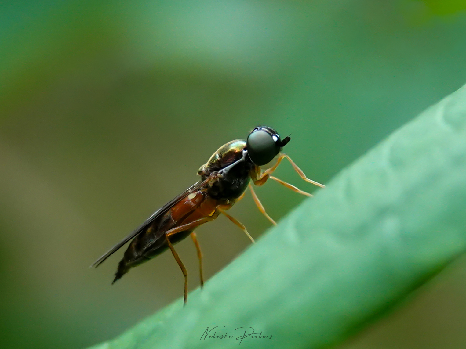 •Thorax glanzend metallic groen, scutellum zonder stekels en een karakteristieke vleugeladering
