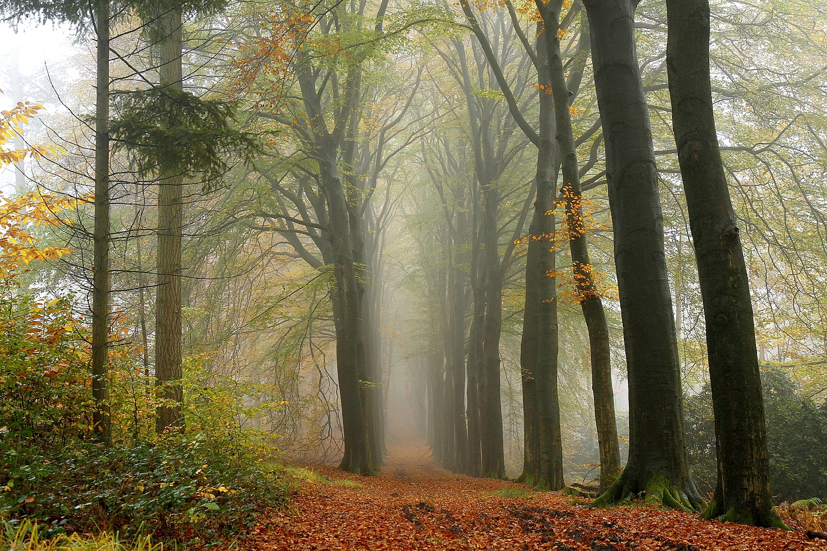 Beukenlaan met verkleurende bladeren en in de mist zorgen voor herfstsfeer.