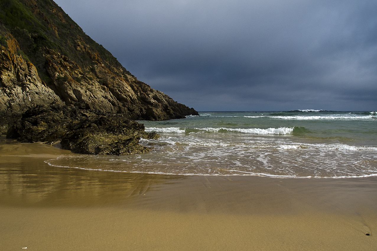 Een dreigende lucht over de zee bij Herolds baai in Zuid Afrika . Een kleine bundel zonlicht schijnt nog over de rotsen voor de bui los barst